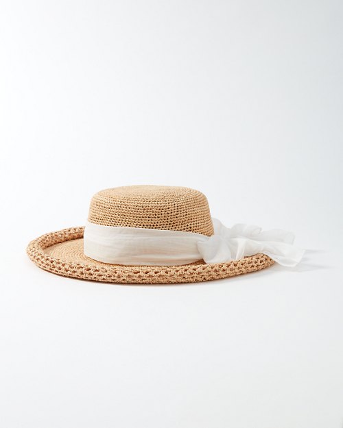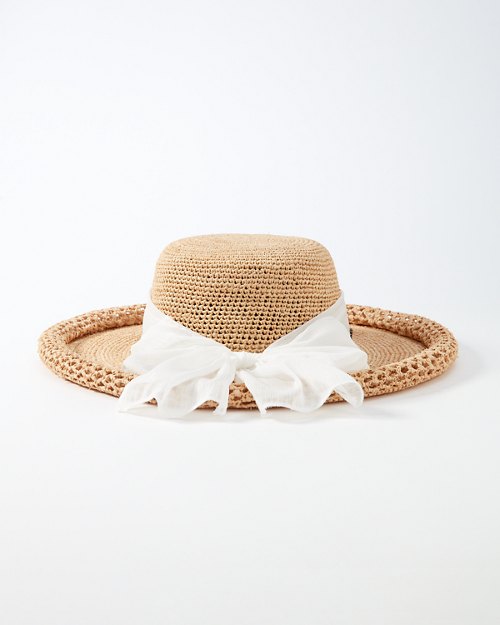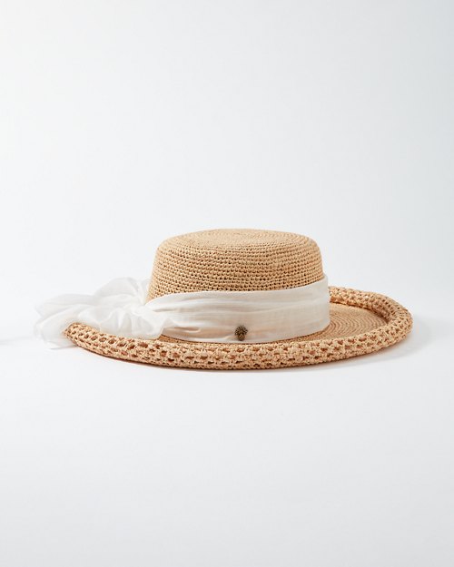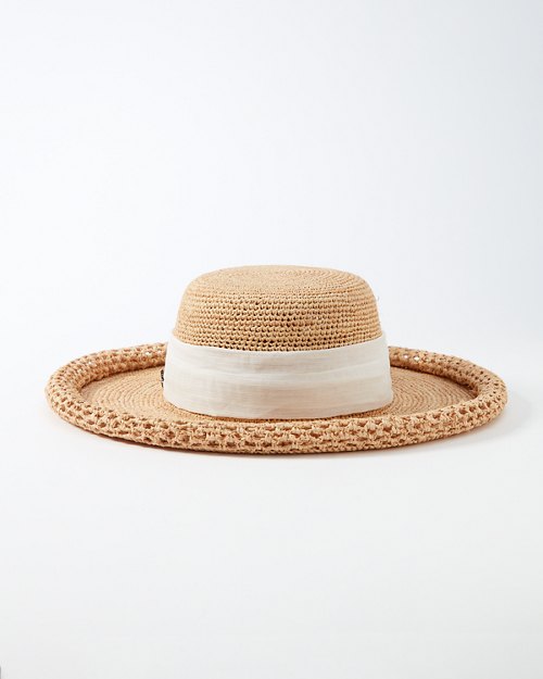 With versatile style, this crocheted raffia hat is ideal for lounging poolside or taking in historical sights on an afternoon tour. The inner elasticized sweatband ensures that one size fits most; finished with a pineapple pin.