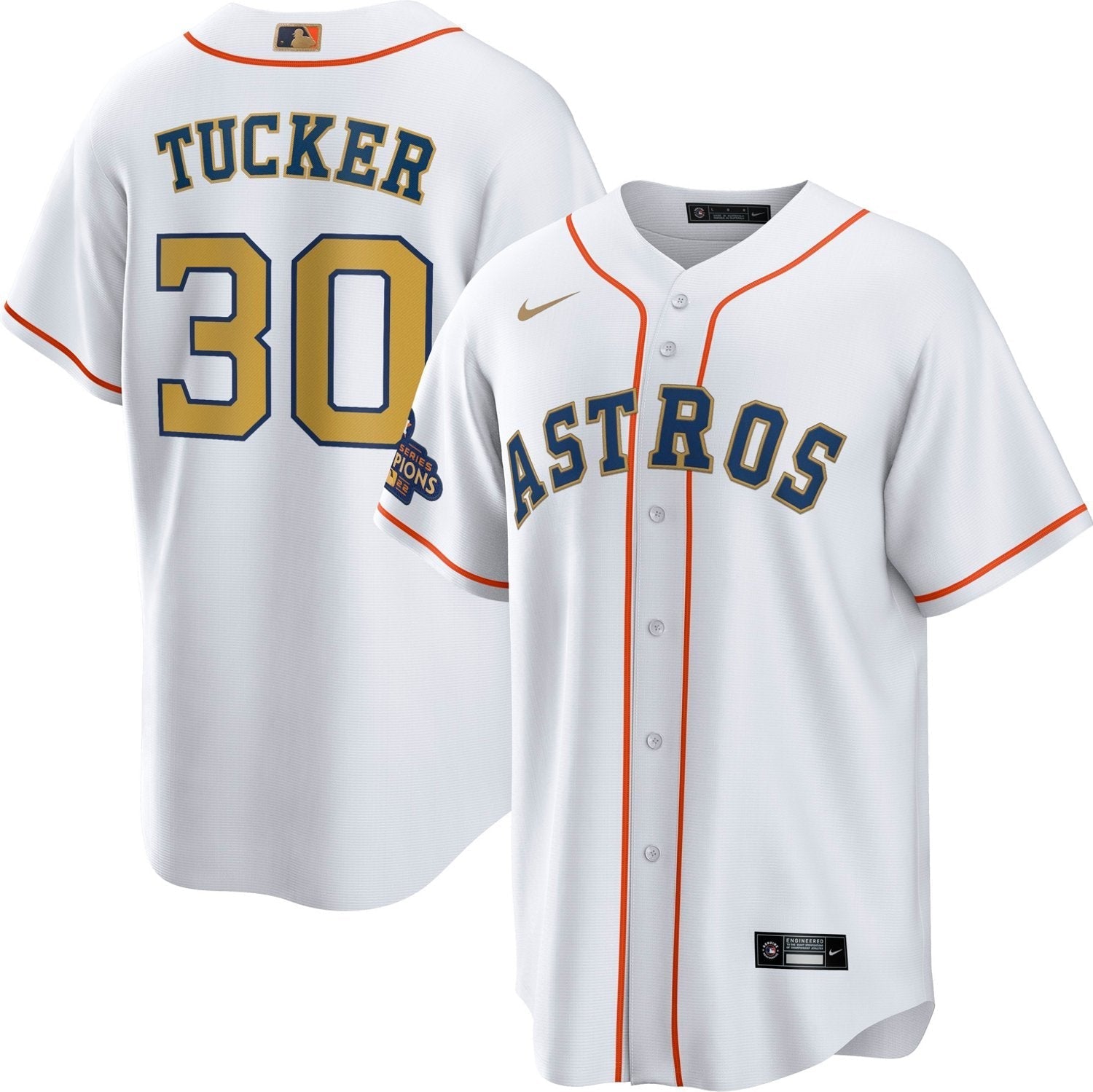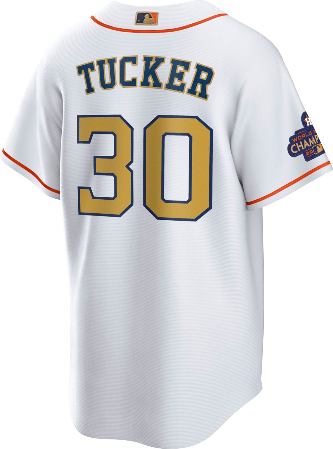 Rep your favorite player with the Men's Houston Astros Tucker Gold Replica Jersey. The polyester coolbase jersey fabric provides a comfortable feel while the graphic design shows off your Astros pride.