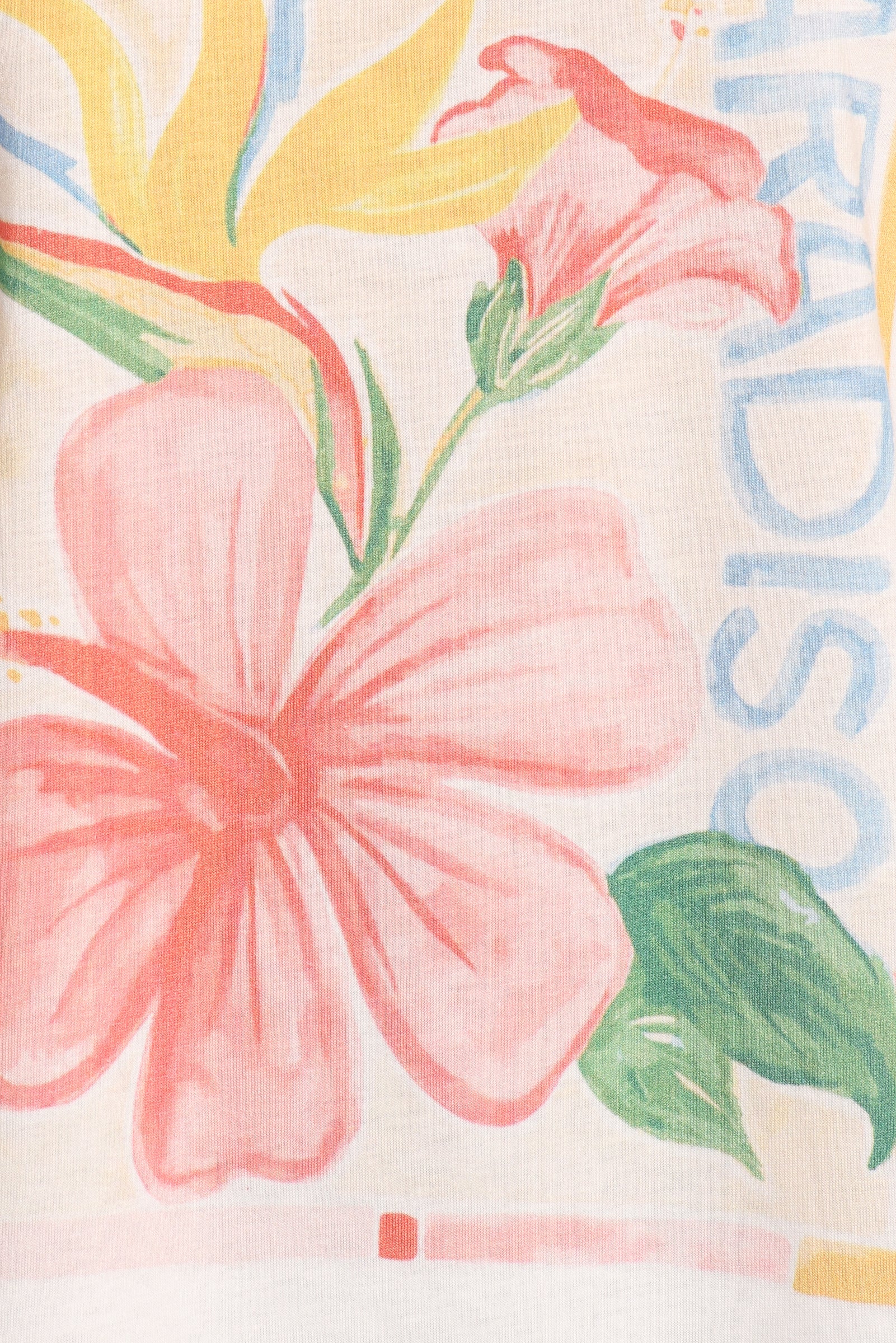 DETAILS The perfect addition to your summer wardrobe, this paradiso tee features a round neckline and short sleeves for all-day comfort. To top it off, a creative floral graphic feature gives you an fun but feminine look.