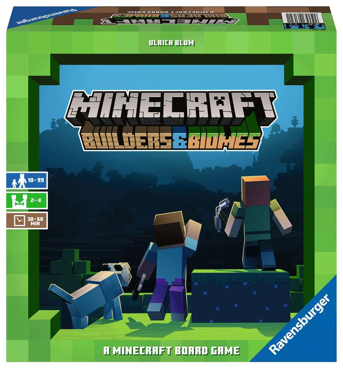 As in the original Minecraft digital game, in Minecraft: Builders & Biomes players explore the Overworld, build structures, and mine resources, earning points for structures and the largest connected biomes of forest, desert, mountain, or snowy tundra spaces on their player boards.