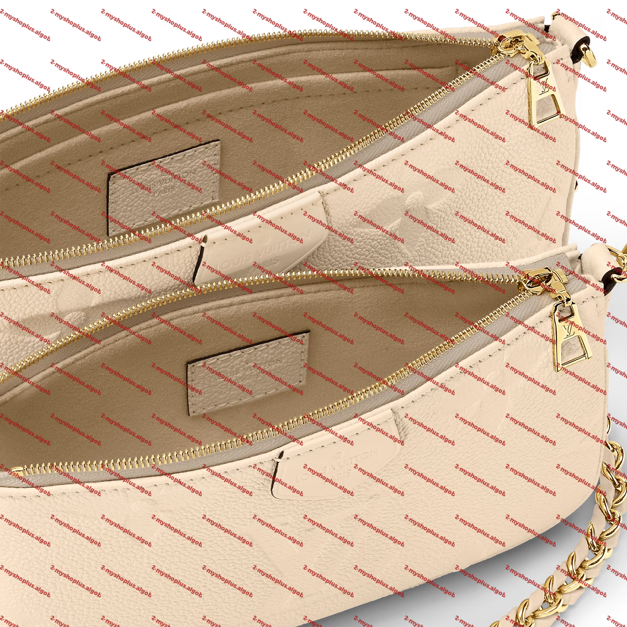 Made from cream-colored Monogram Empreinte leather, the Multi Pochette Accessoires handbag is composed of two pouches attached together. Both pouches are lined with matching cream-color microfiber, with the larger pouch also including an inside pocket. Thanks to a chain and a strap, both removable, this bag becomes very verstaile.
