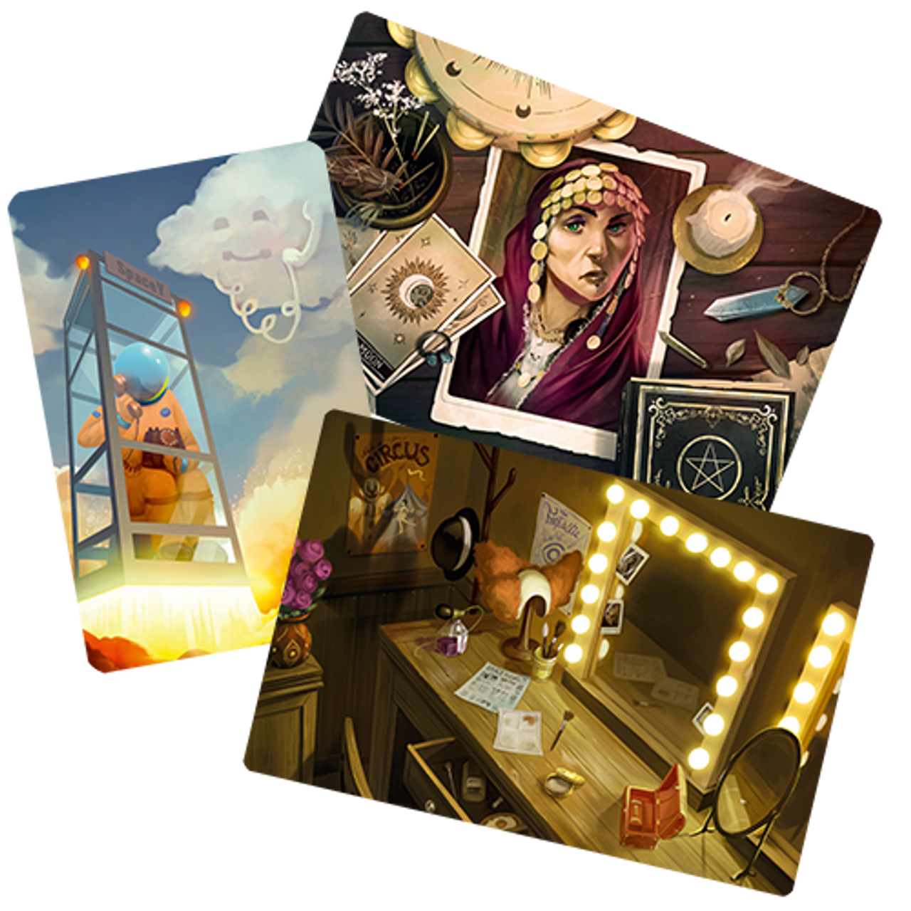 In this asymmetrical cooperative game, the ghost sends visions with illustrated cards. The psychics try to interpret them to exonerate the safe suspects and locations and, finally, seize the only chance to understand what happened a few years ago. Players have six enjoyable nights before the carnival leaves. They must open their minds and find the truth!