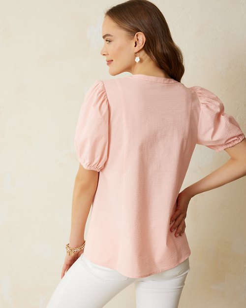 Made-for-summer seersucker cotton makes this top a seasonal essential. With an of-the-moment, puff-sleeve design, this top is ready to bring a whole new wave of stylish relaxation to any look.