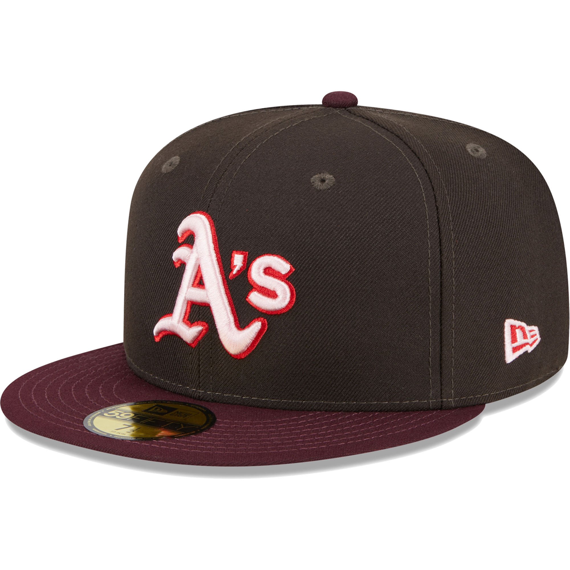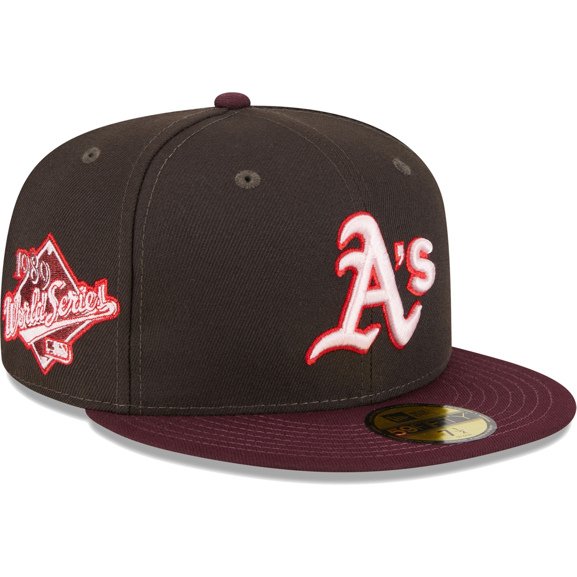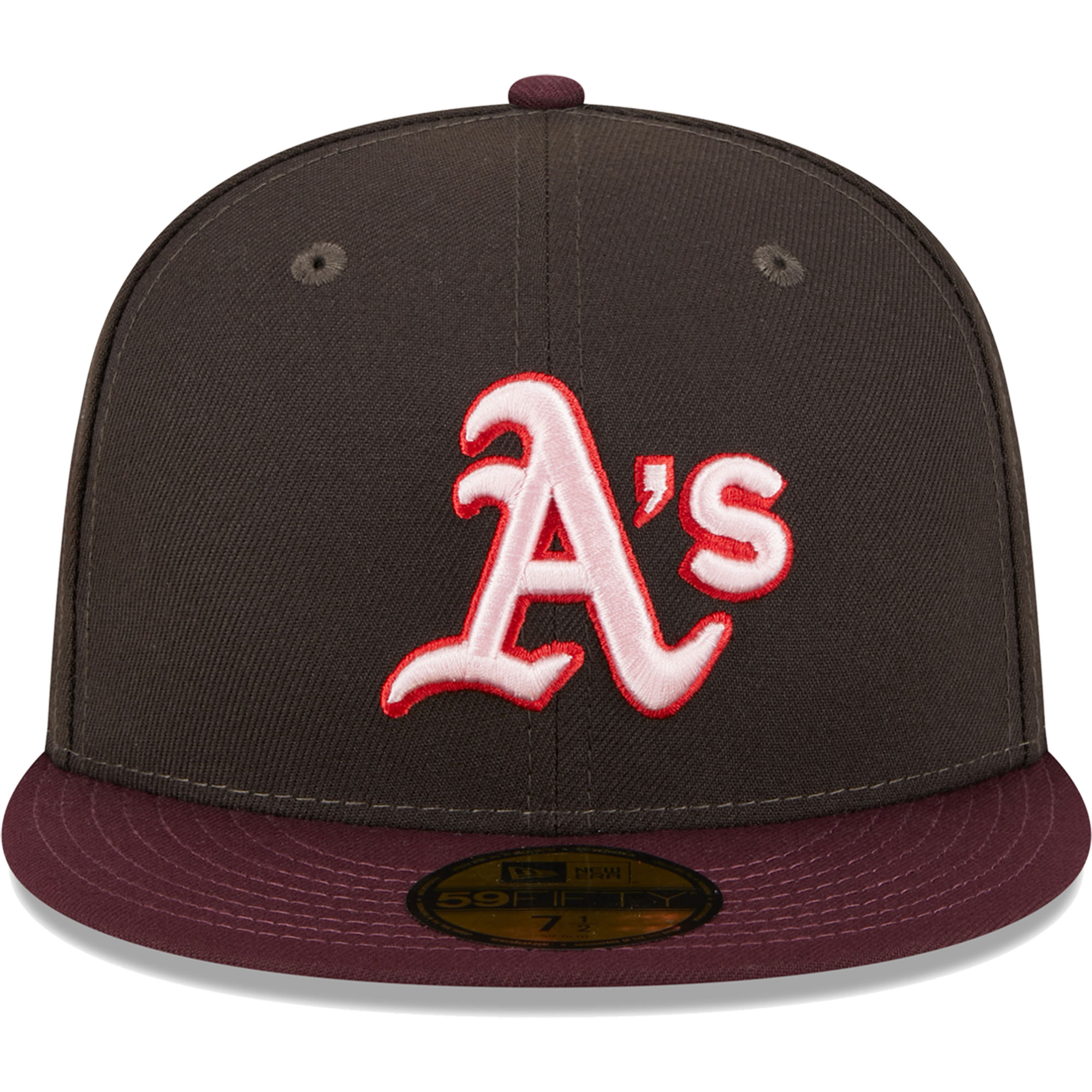 Add a tasteful piece of Oakland Athletics gear to your collection by picking up this Chocolate Strawberry 59FIFTY hat from New Era. It features the team's logo embroidered on the front and a celebratory patch on the right side. The red undervisor on this fitted cap adds a pop of color giving it a unique look that is perfect to go along with any Oakland Athletics game day outfit.