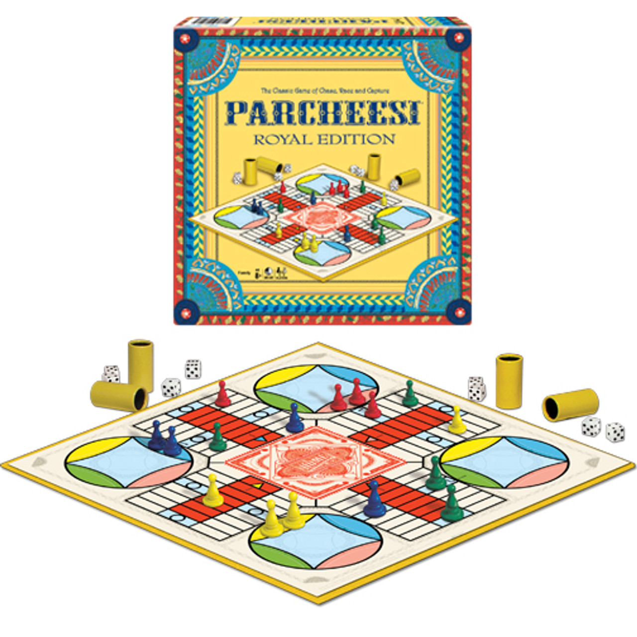 The cherished look and feel of Parcheesi, including the dice cups, will surely bring back fond memories. In Parcheesi® Royal Edition, players race to get all of their pawns into the center home space.