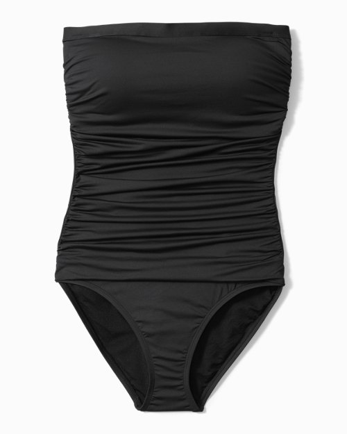 Jump into some seaside fun with this bandeau one-piece swimsuit. This bathing suit features chic shirring and a slimming inner panel so you can look and feel your best. A removable strap allows for a tan line-free look.