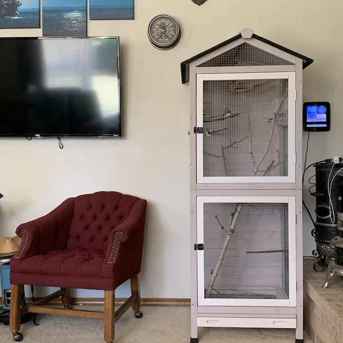 Birds are happiest when they can flap and flutter freely within their living quarters. This birdcage is ideal for parakeets, finches, and other small birds. With a weatherproof finish, it can be used both indoors and out. It is constructed from solid wood and metal, with a weatherproof glazed pine finish, in neutral gray and white hues. It includes a pull-out tray for easy cleaning.