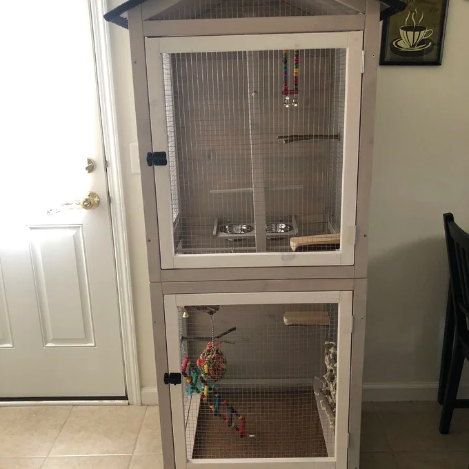 Birds are happiest when they can flap and flutter freely within their living quarters. This birdcage is ideal for parakeets, finches, and other small birds. With a weatherproof finish, it can be used both indoors and out. It is constructed from solid wood and metal, with a weatherproof glazed pine finish, in neutral gray and white hues. It includes a pull-out tray for easy cleaning.