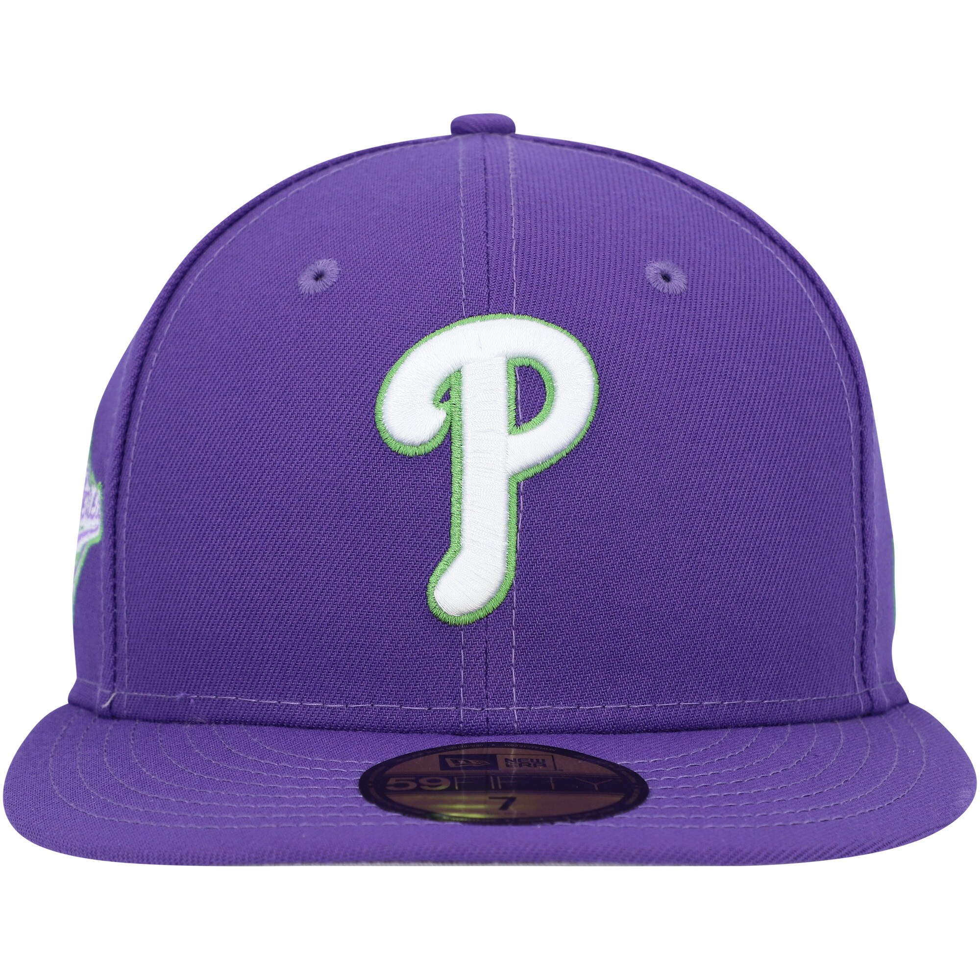 Emphasize your unwavering Philadelphia Phillies fandom by picking up this Lime Side Patch 59FIFTY hat from New Era It features the team's unmistakable logo on the front and a celebratory patch embroidered on the side that is sure to help you pay homage to the club's storied past. The structured feel of this fitted cap will quickly make it a staple in your Philadelphia Phillies game day rotation.