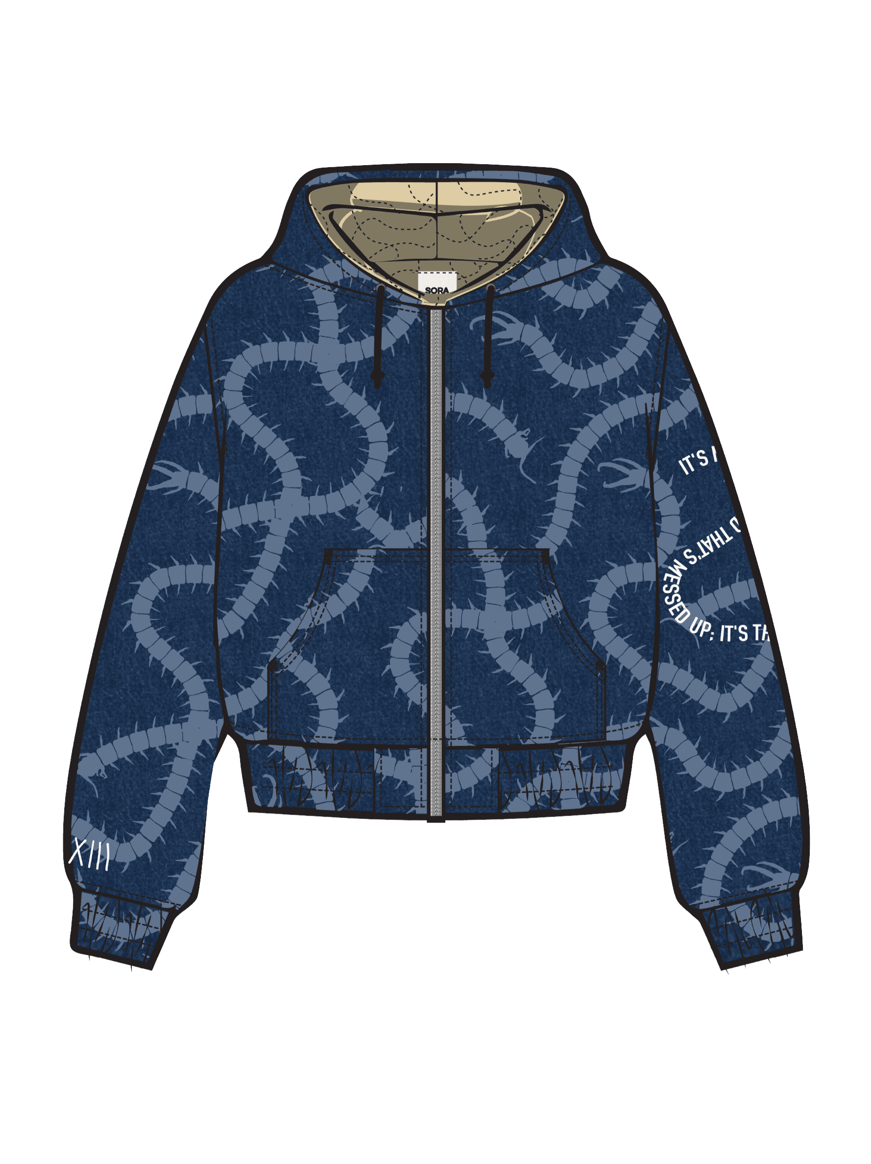 Heavyweight Denim Jacket with laser-printed designs on the front and back and embroidery design on the sleeve. This Jacket is made of 100% denim. Soft and comfortable, warm and breathable.