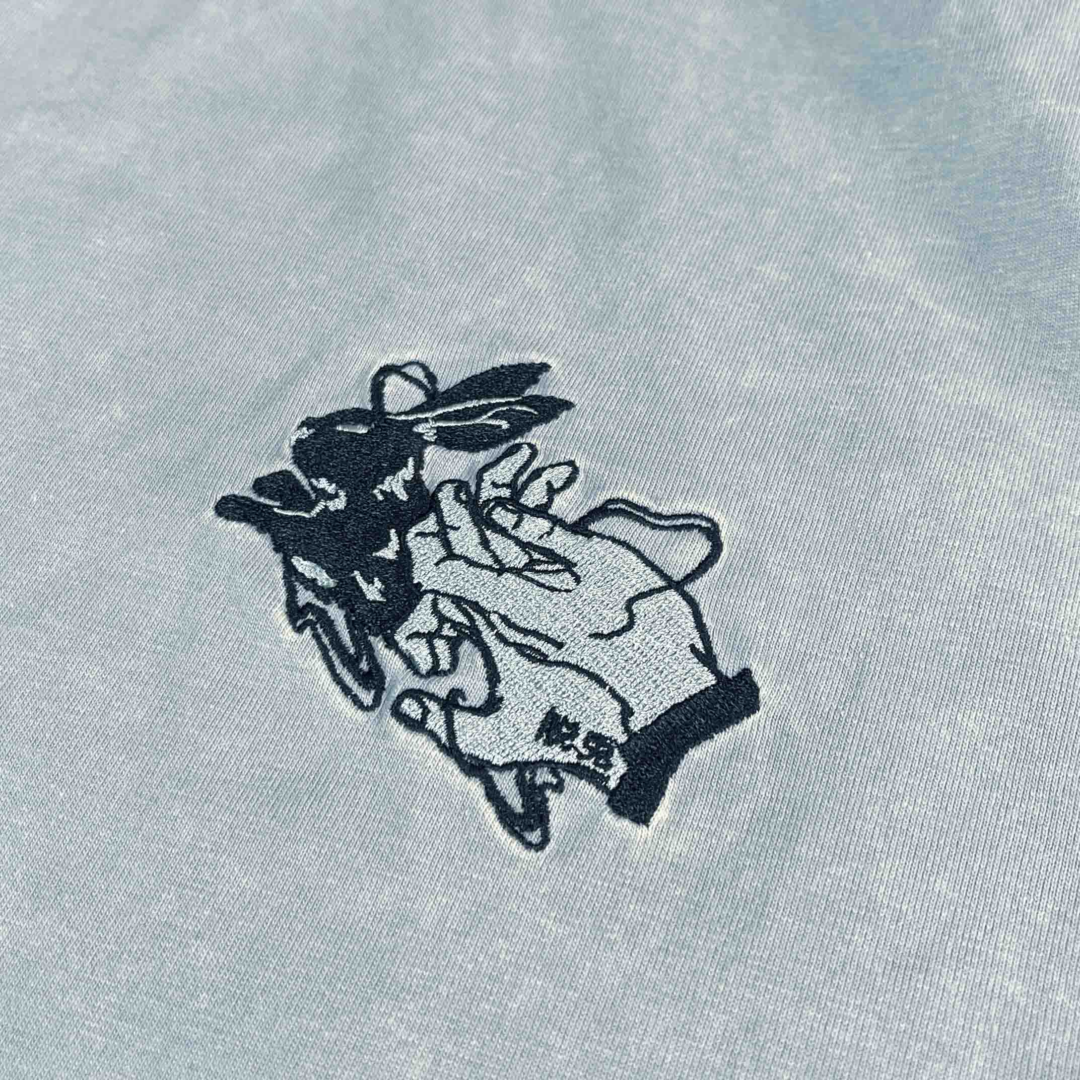 This T-shirt was created in a?pigment-dyed?light blue colour. This custom heavy jersey tee was developed to have a relaxed fit and vintage feel. Includes front stitch embroidery.?