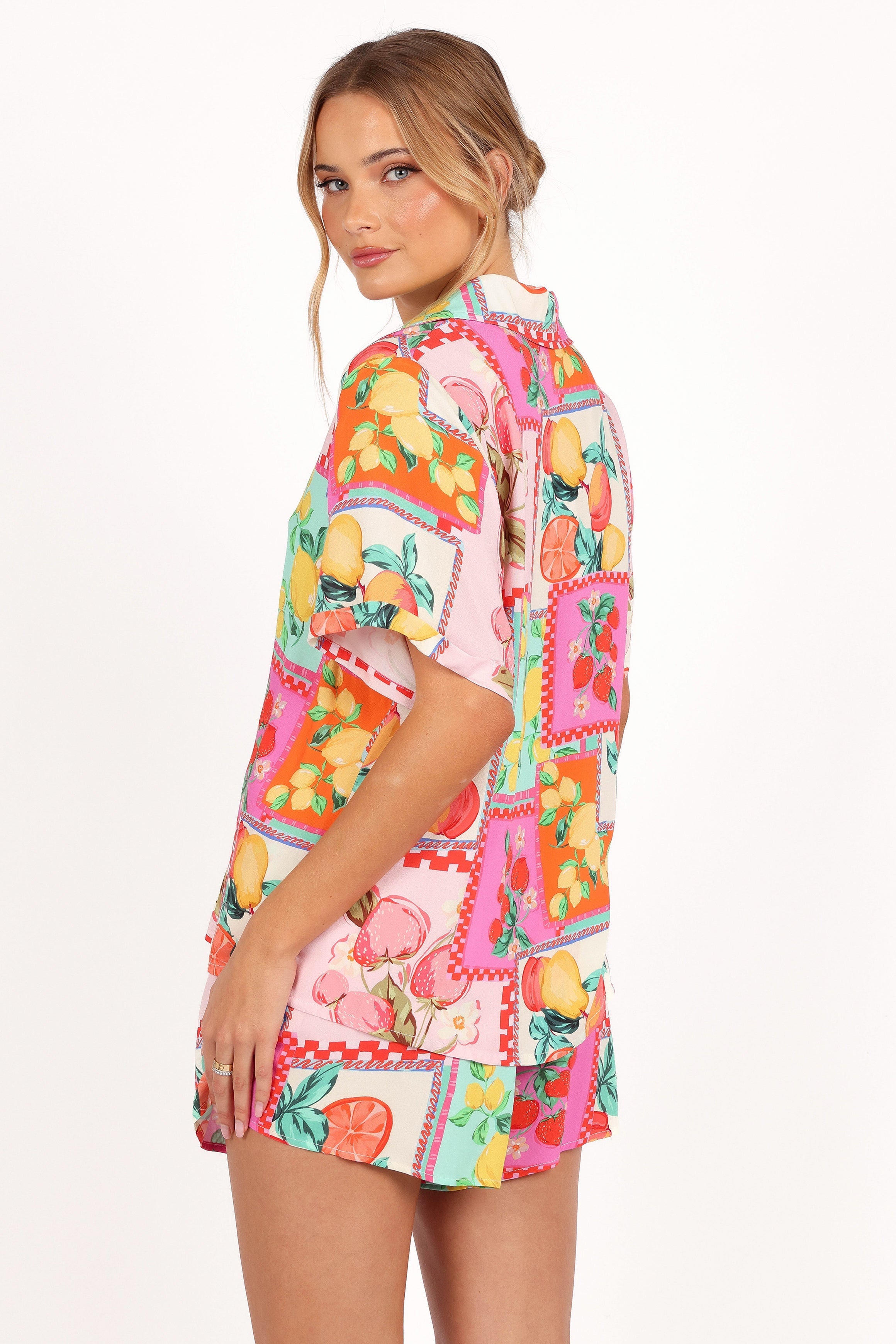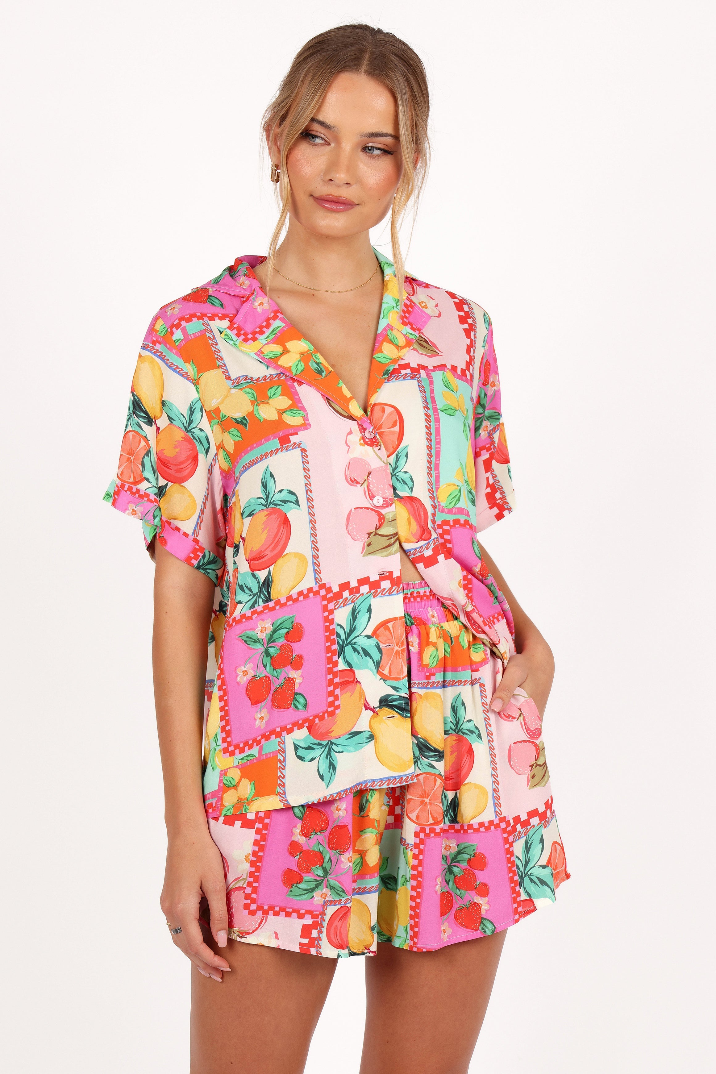 | DETAILS Heading on vacation? This top and shorts set is perfect for making a statement while relaxing in the sun! The top features a v neckline, spread collar, short sleeves, and functional button down front.