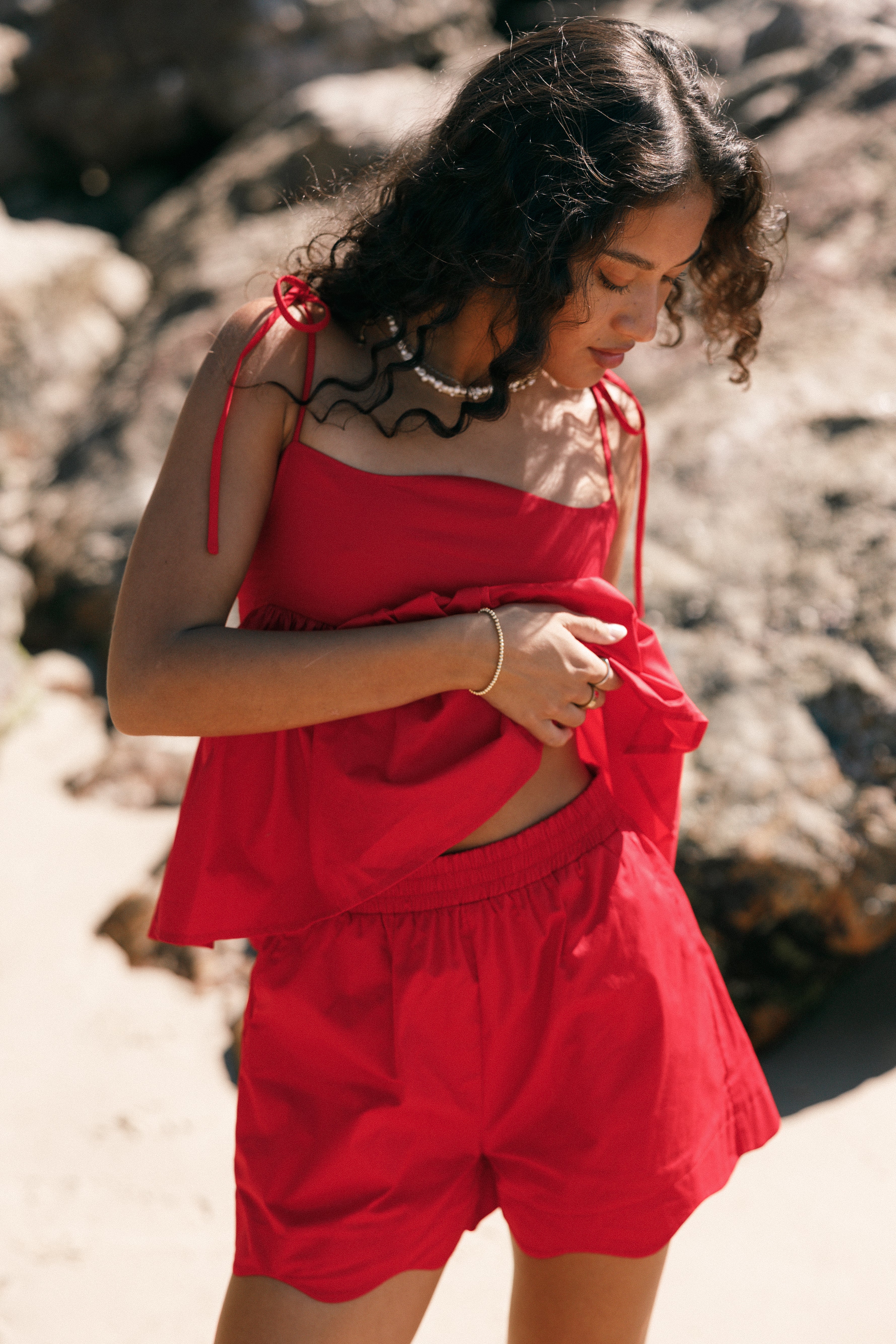 | DETAILS Meet our Ricci Shorts in vibrant Red! These high-waisted statement pieces are designed with functionality and style in mind. Featuring a comfortable elasticised waistband and practical pockets, they're as versatile as they are fashionable.