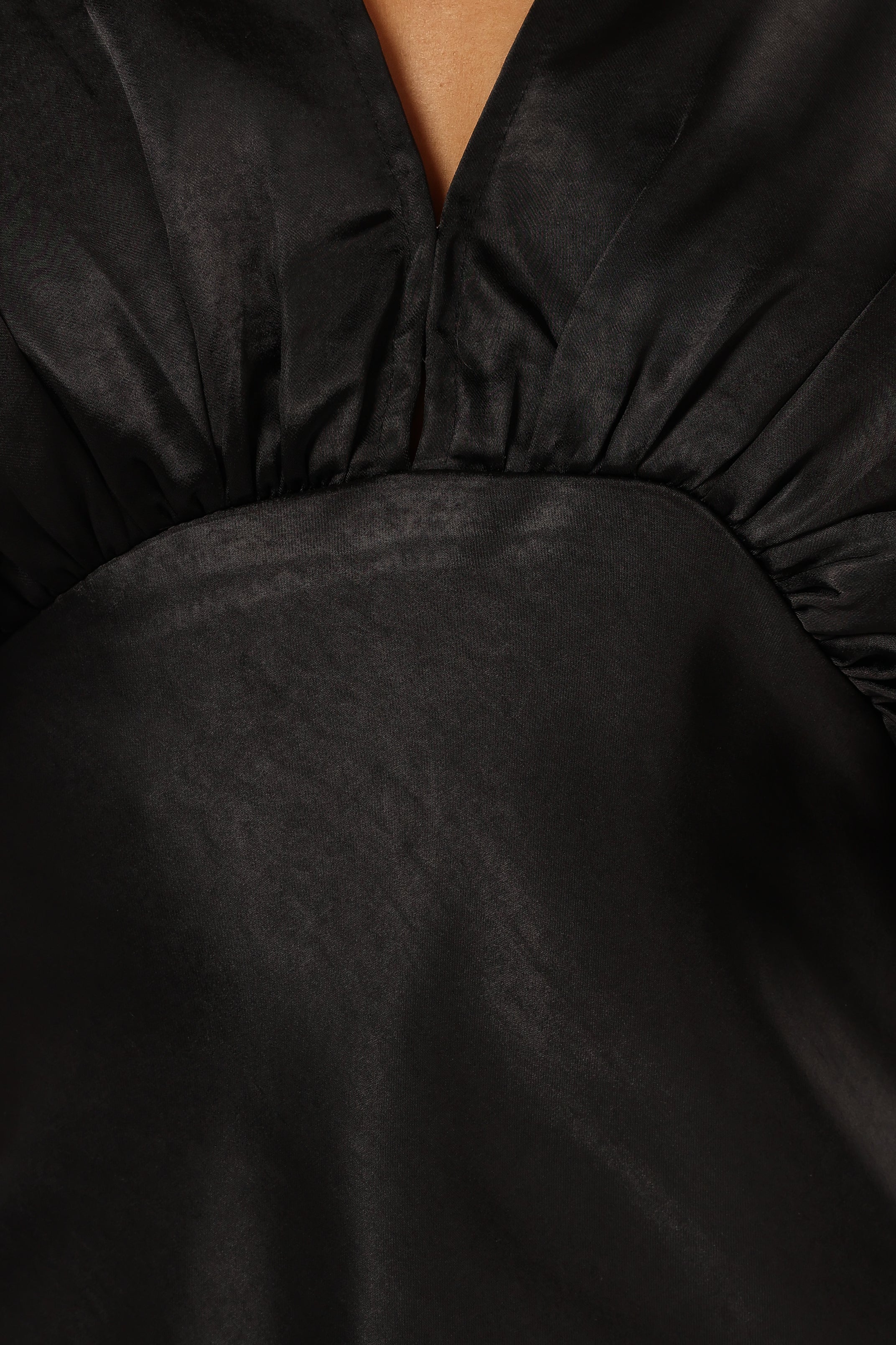 DETAILS This elegant mini dress is perfect for any special occasion. It features a v neckline with hook and eye closure, gathered bust detail, and short sleeves. With it's satin sheen finish you'll be sure to turn heads wherever you go!
