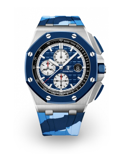 DIAL : Blue dial with “Méga Tapisserie” pattern, rhodium-toned counters, rhodium-toned external zone, white gold applied hour-markers and Royal Oak hands, black inner bezel.
