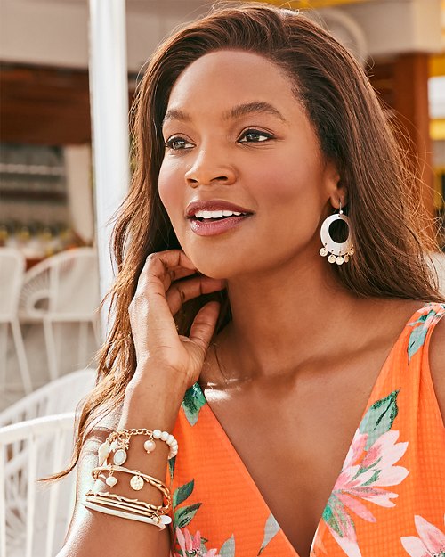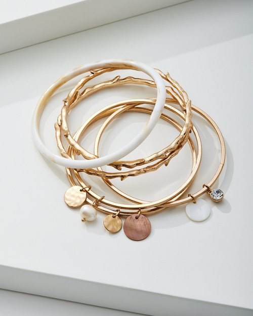 Add a little shimmer and shine to every outfit, with this stackable set of six bangles. Featuring disc and pearl charms with coral motifs, this summer-approved bracelet set is ready to make a statement wherever you wander.