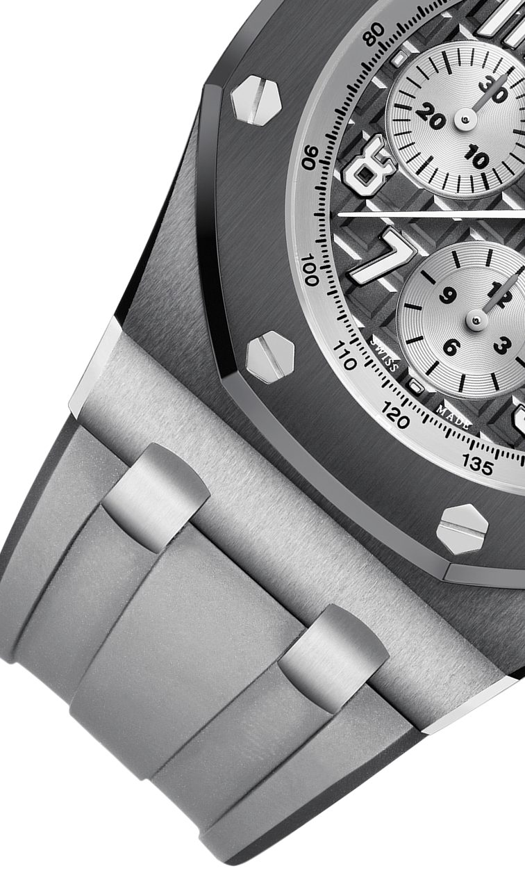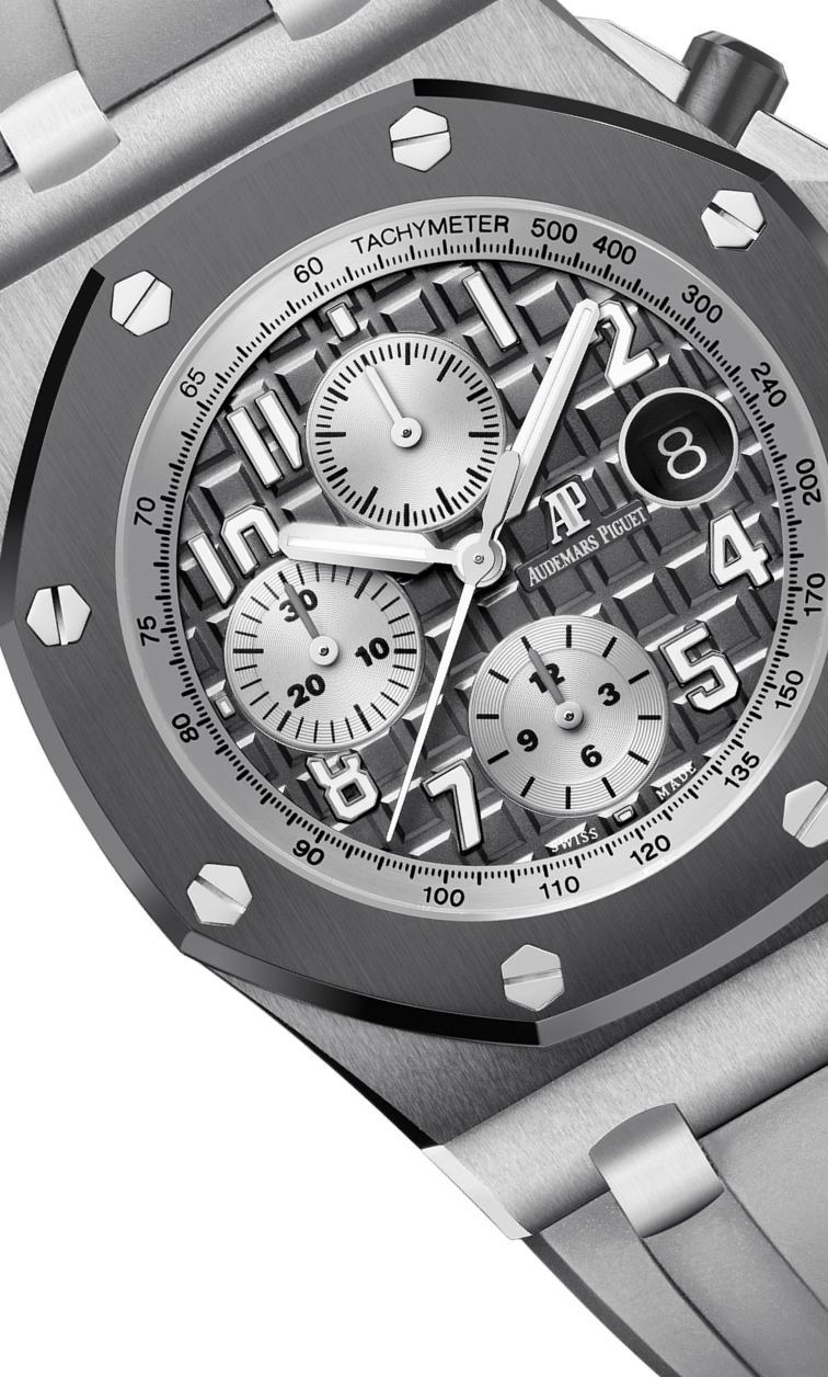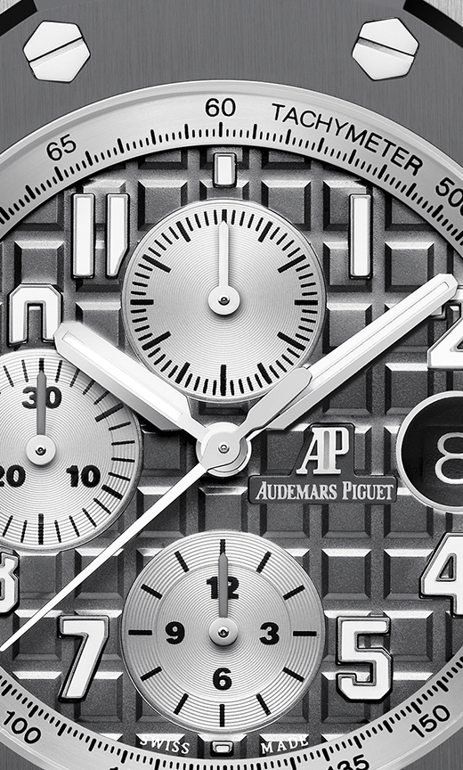 DIAL : Slate grey dial with “Méga Tapisserie” pattern, silver-toned counters, Arabic numerals with luminescent coating, white gold Royal Oak hands with luminescent coating, silver-toned inner bezel.