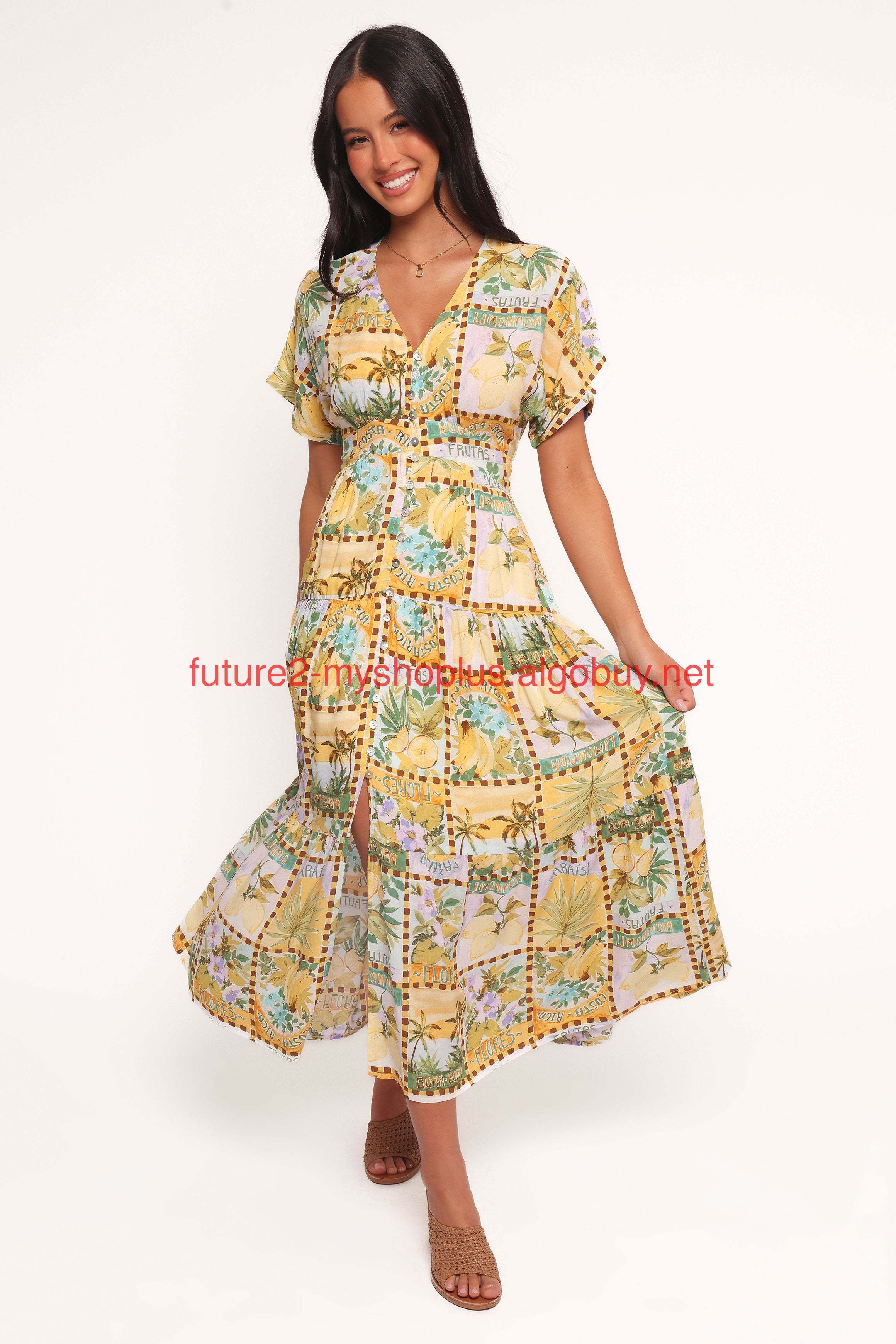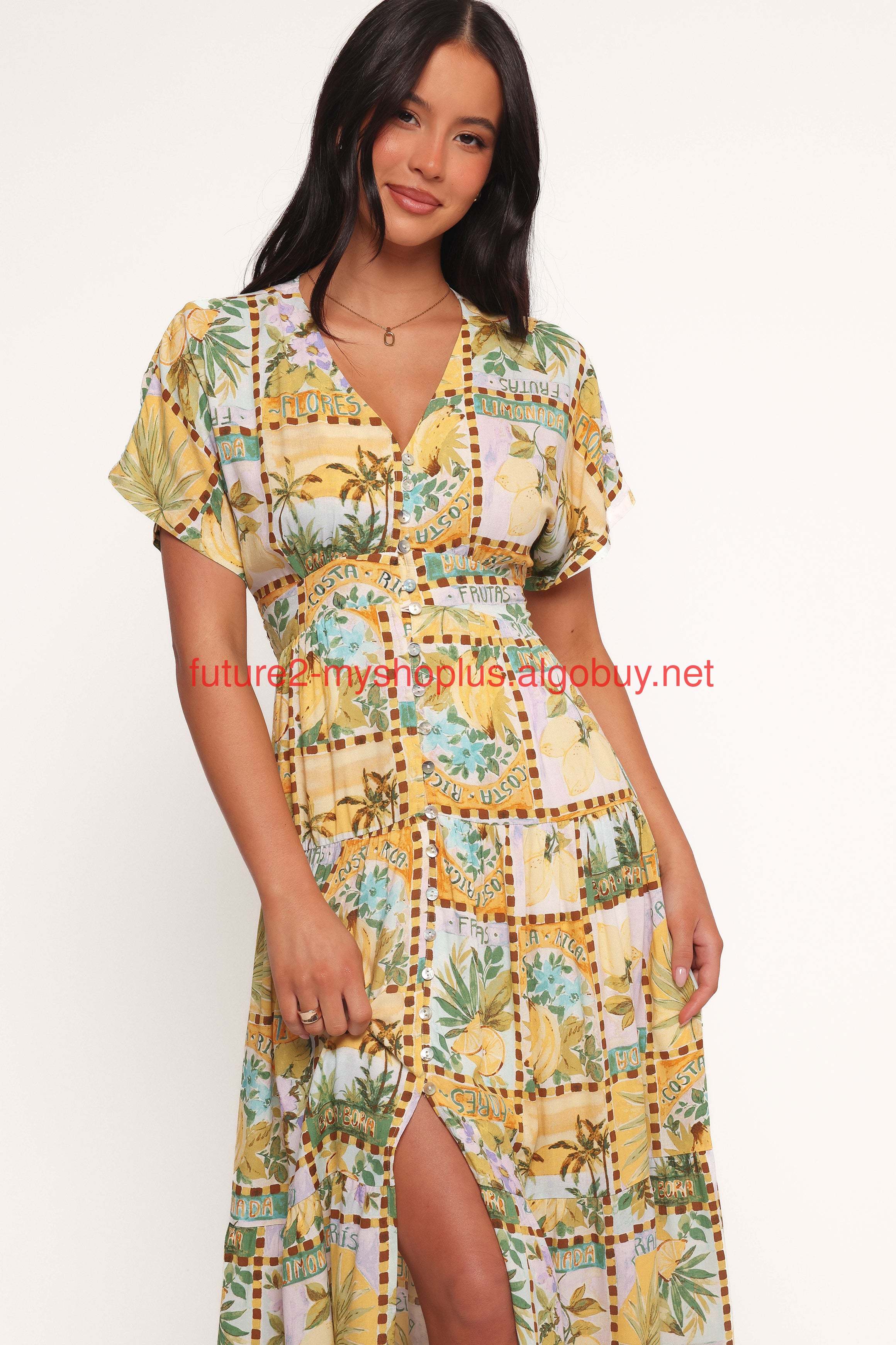 DETAILS Step into a world of effortless elegance with the Sorrento Maxi Dress - Tropical Sun. Designed for comfort and style, this maxi-length dress features a flattering V neckline and short sleeves that make it perfect for warm, sunny days.