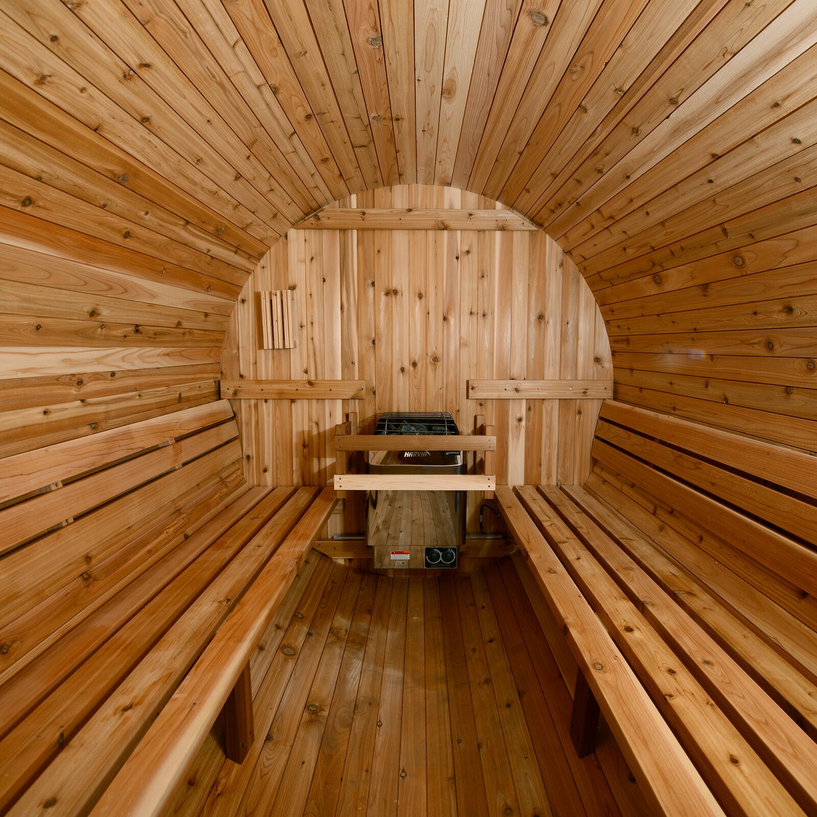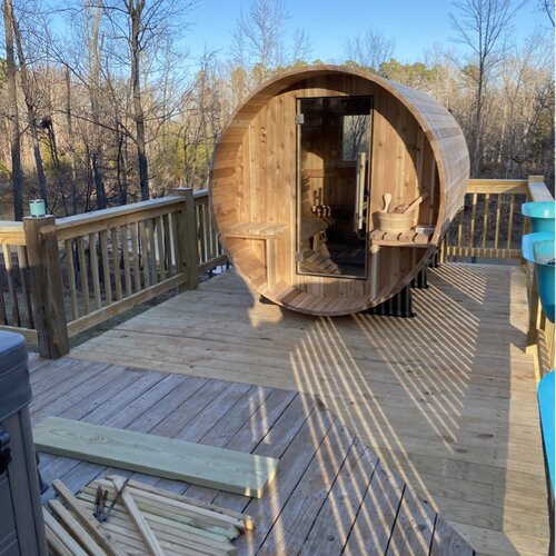 A:"In very rainy and humid climates, it's important to cover the barrel with a tarp or other roofing material to prevent too much rainwater from entering the sauna. Regular use of your heater is also necessary to dry out the wood after rain."