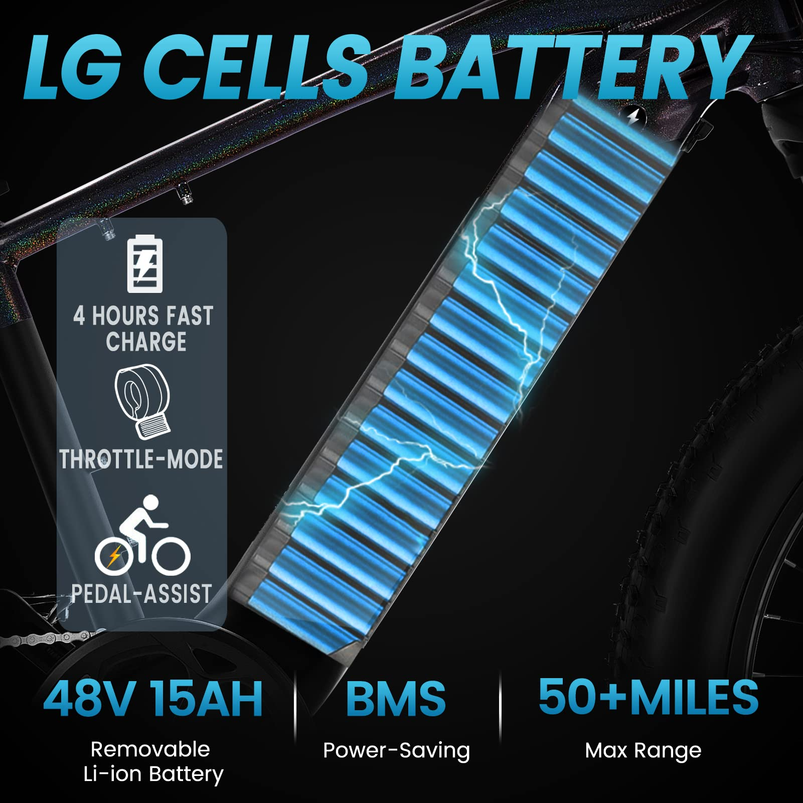 [LARGE CAPACITY LG CELLS BATTERY]Ebike equips with 48V 15AH large capacity LG cells battery,which provides 4 hours fast charge. It covers a range of 25-50+ miles per full charge. The battery is removable, hidden, waterproof and convenient to bring home or office for charging.