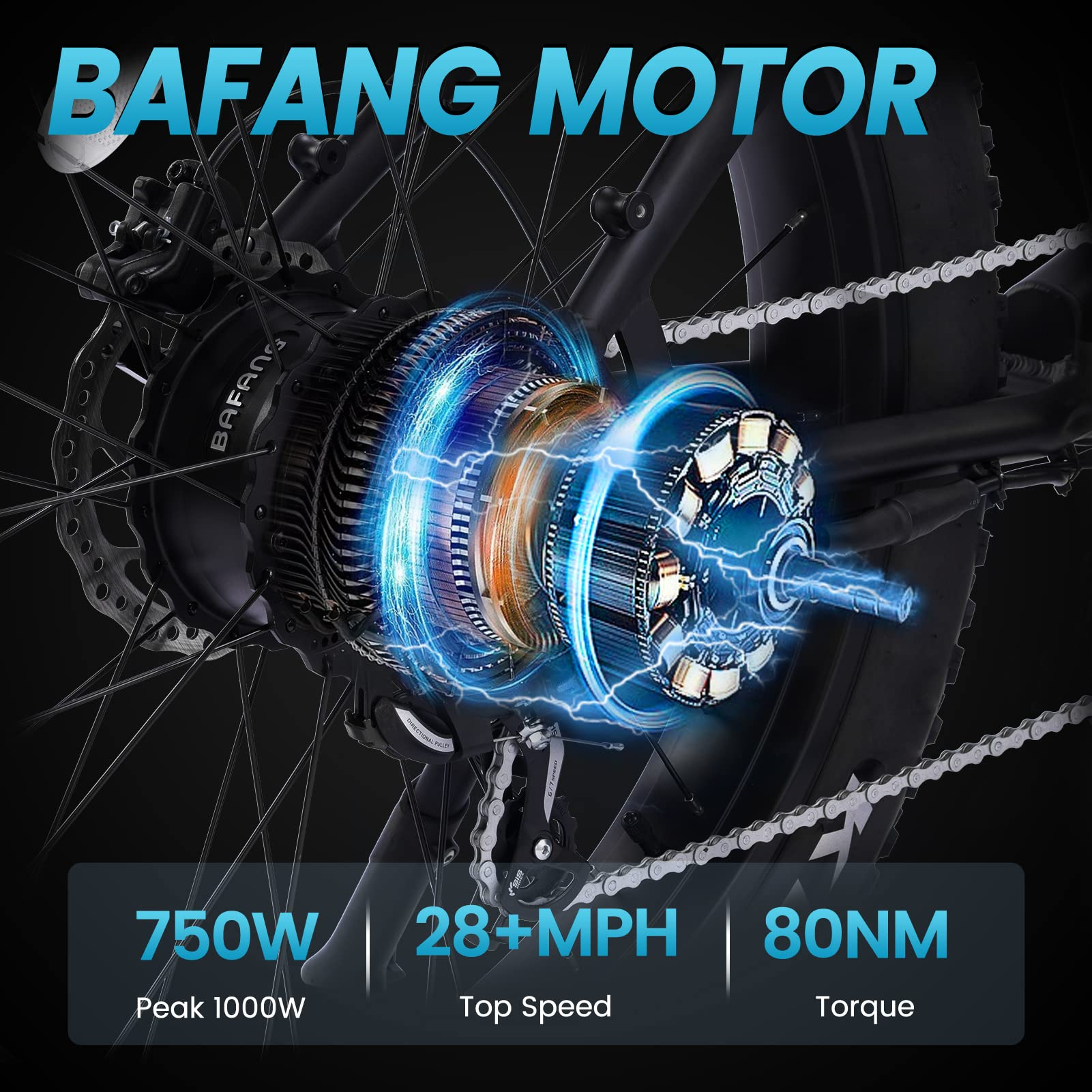 [750W POWERFUL BAFANG MOTOR]750W high-speed BAFANG brushless motor provides electric bike max speed up to 28 mph. 80Nm of torque is enough for your daily riding on all terrains, ensuring excellent riding experience off-road. BAFANG motor as a top brand motor,which has longer using life and less maintenance.
