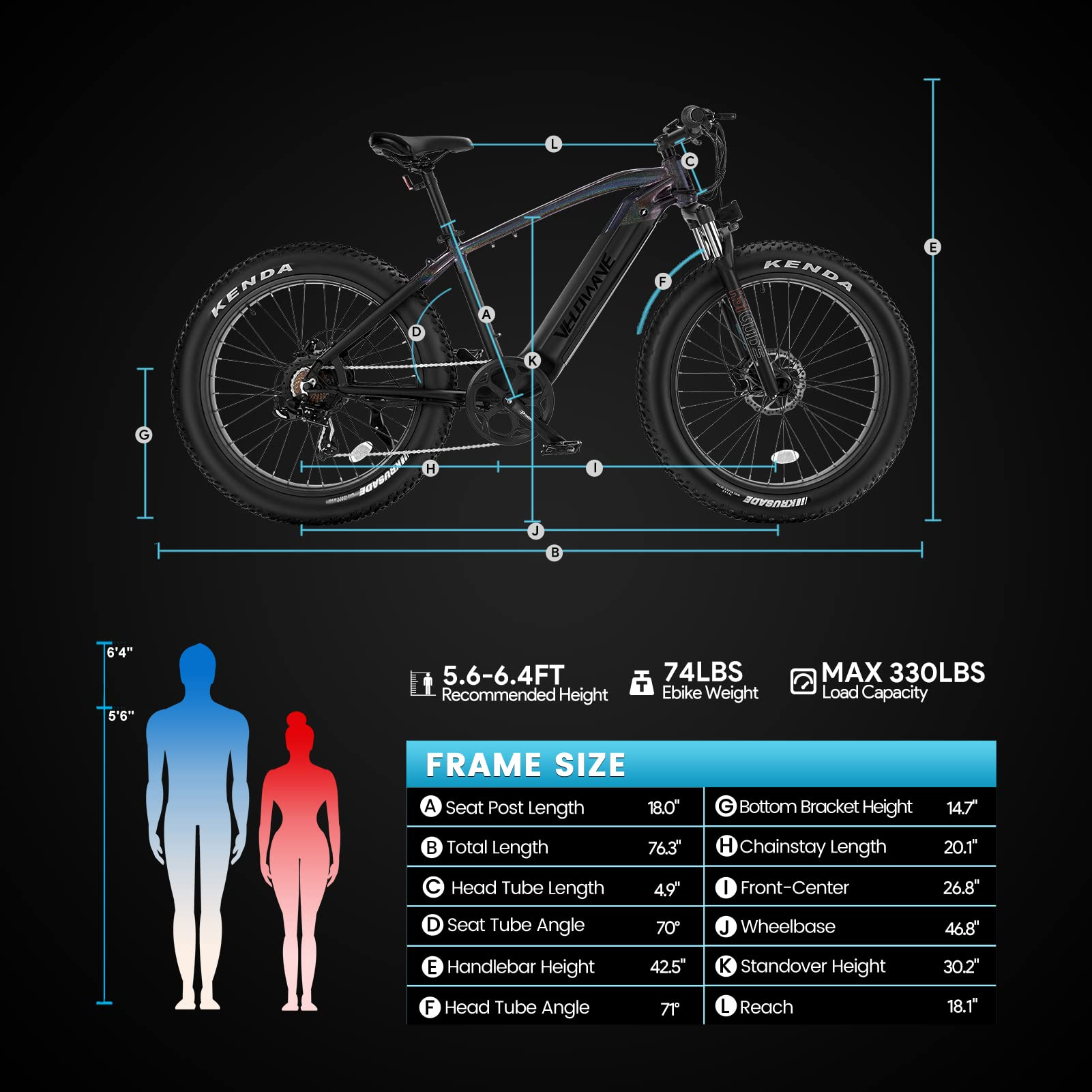 A: The recommended rider height is 5'6" ~ 6'4", payload 330 lbs at maximum.