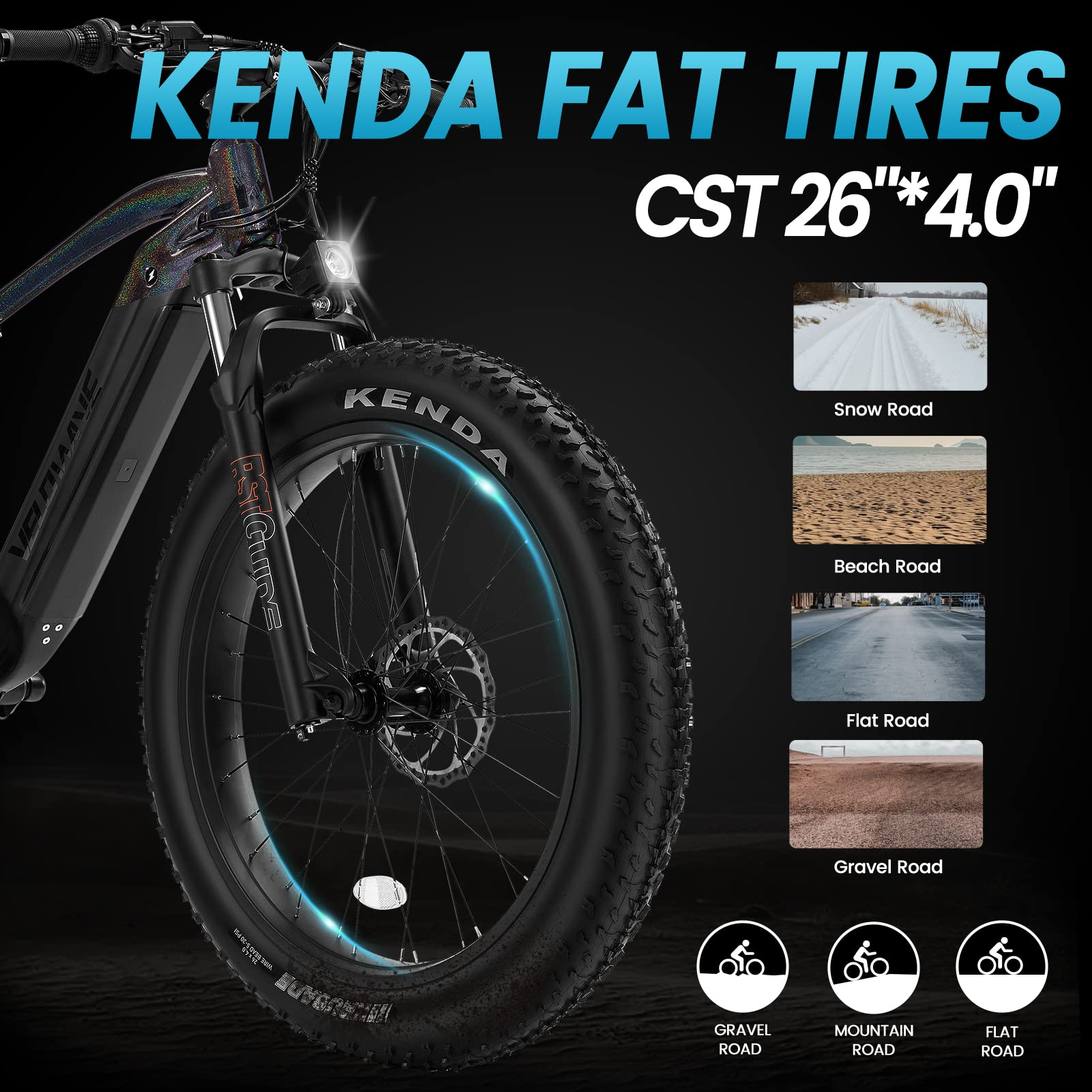 A: 20X4.0" Kenda puncture resistant tires offer upgrade grip and skid resistance ability. The fat tire with unique tread pattern can decline bumps in order to reduce fatigue.
