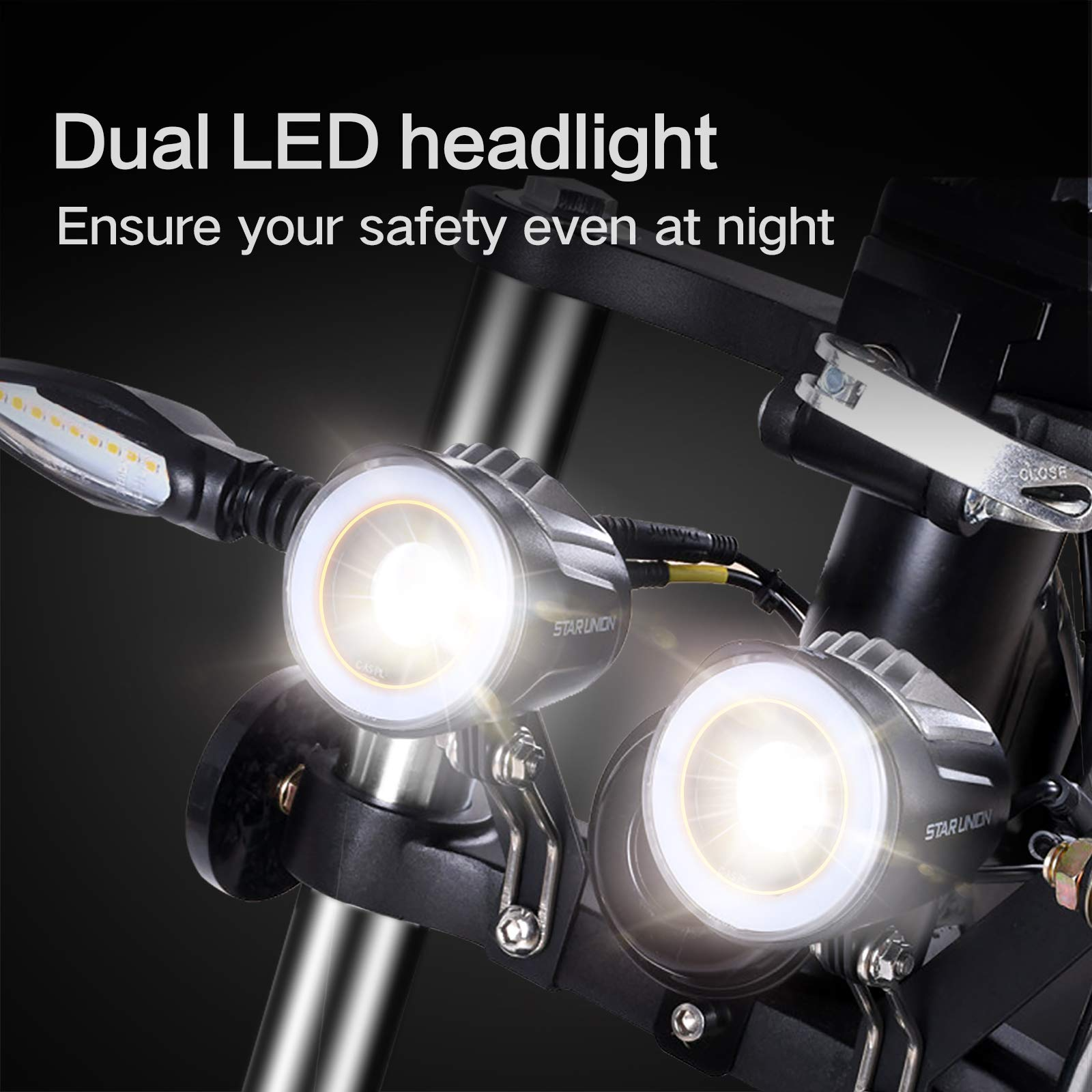 [Dual braking system]-The front and rear disc brakes and EABS (anti-lock braking system) of this adult electric scooter can effectively prevent accidents. The dual brake system can stop the electric scooter in a few seconds. There are also switchable LED headlights and taillights, horns, side brackets, and wide tires that will make you safer to drive the scooter.