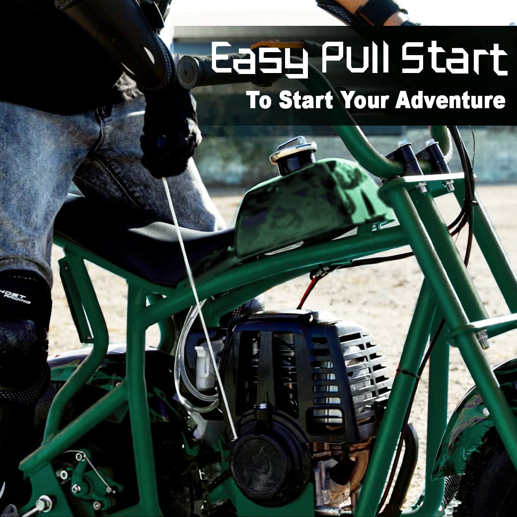 👍 EASY & SMOOTH: FRP DB003 kids powered dirt bike with easy pull start operation makes this the ideal trail kids dirt bike for any teen rider. Low-pressure pneumatic knobby tires provide a soft, smooth ride even on rugged terrain, front tire 4.10-6, rear tire 5.00-6, off-road tire