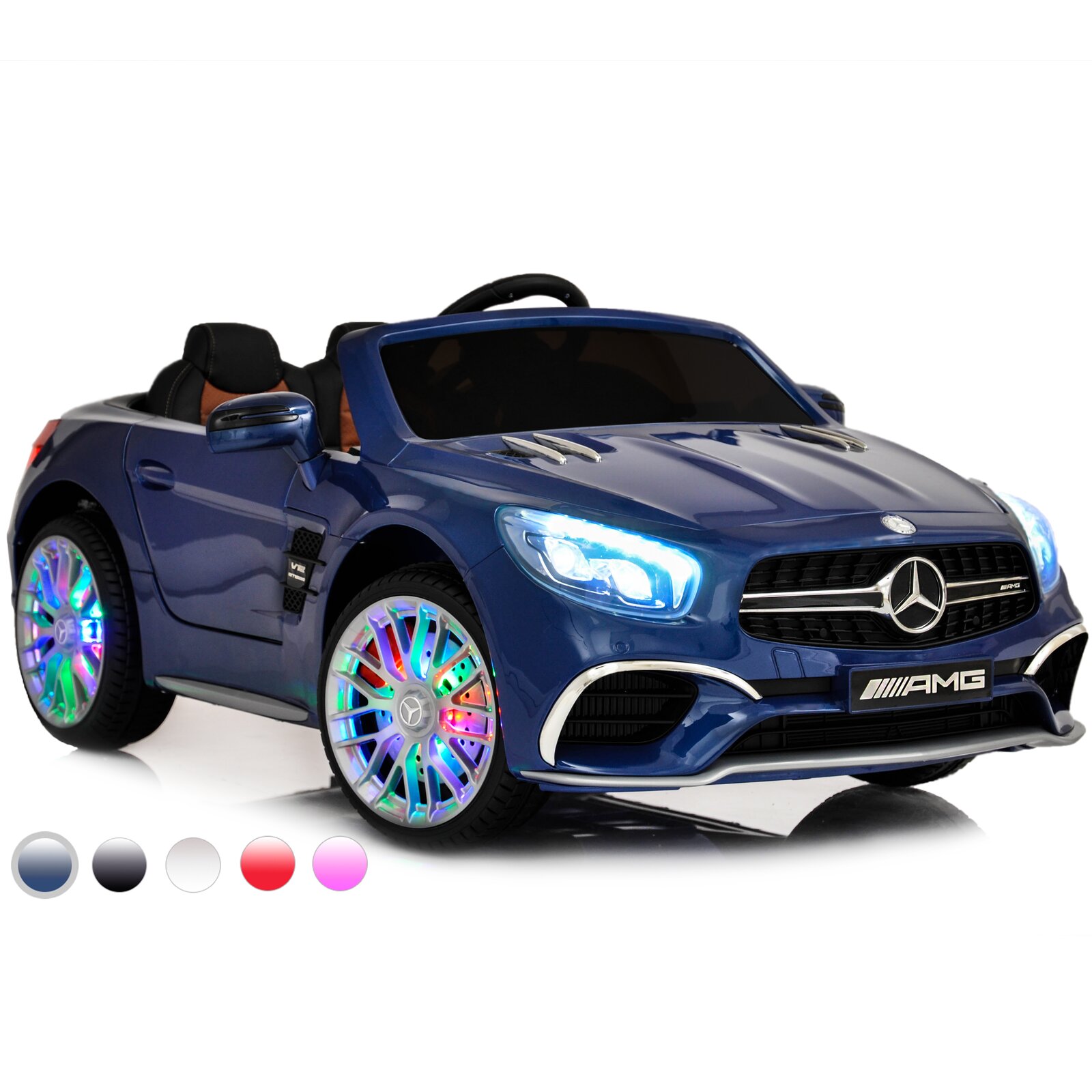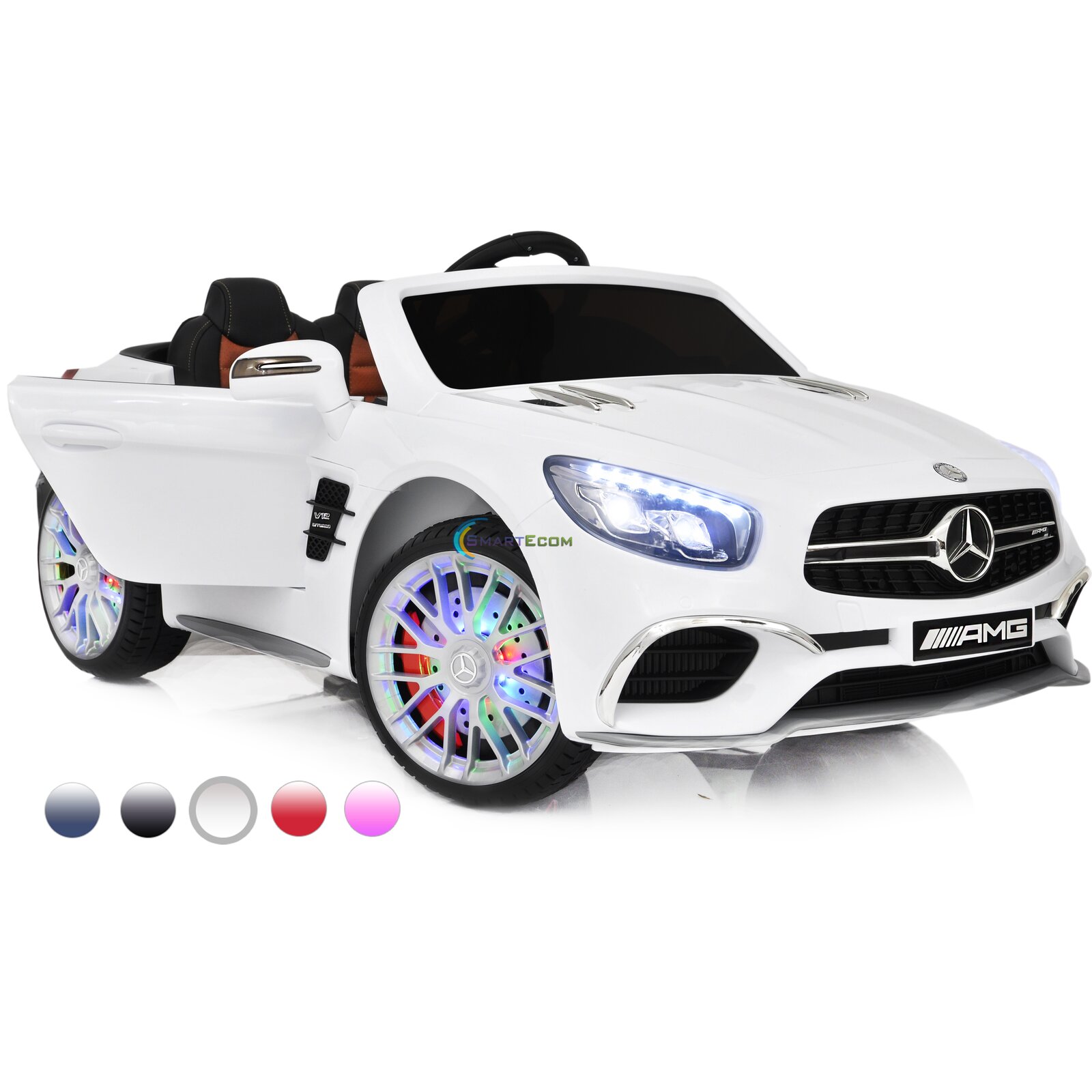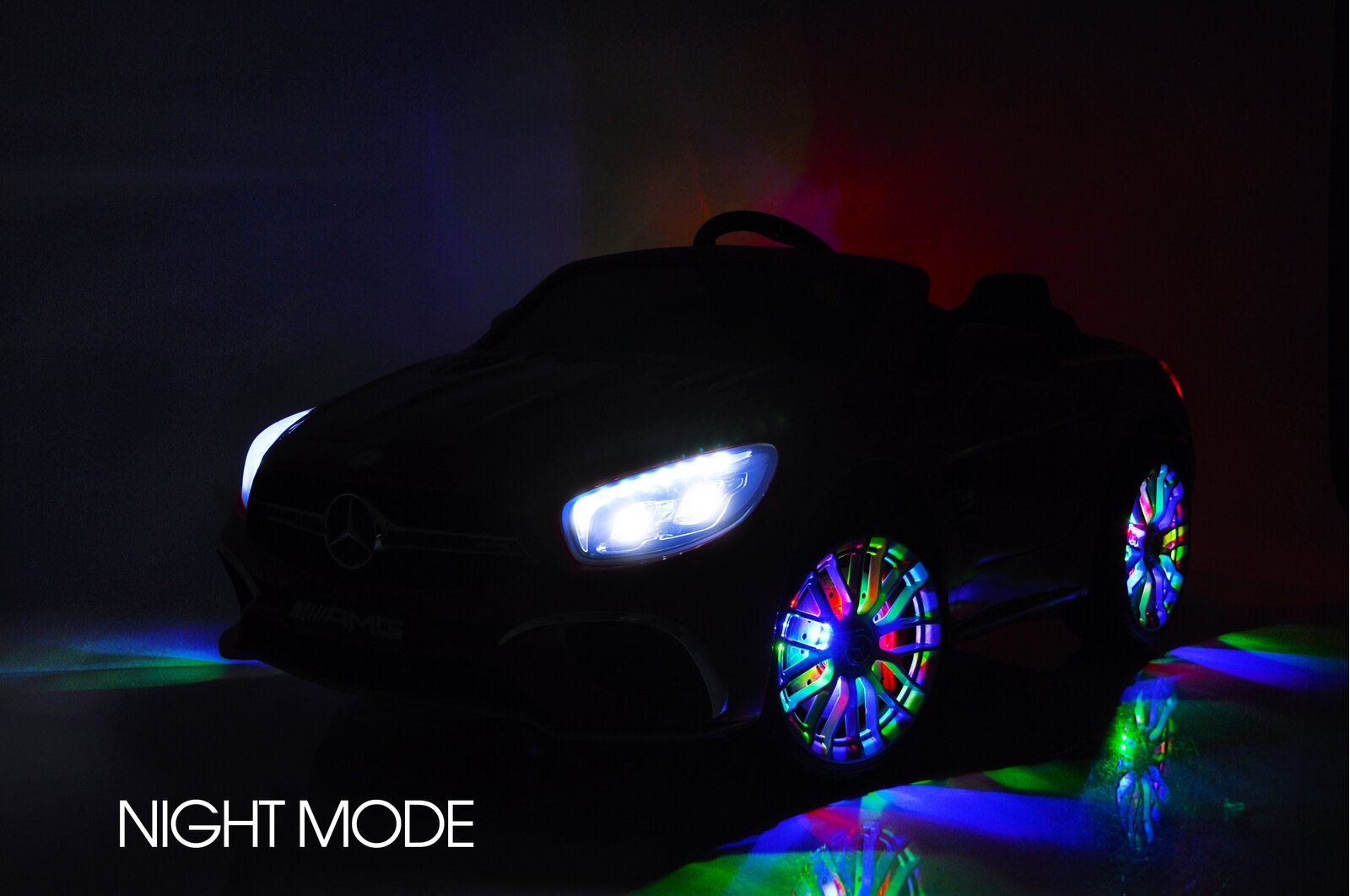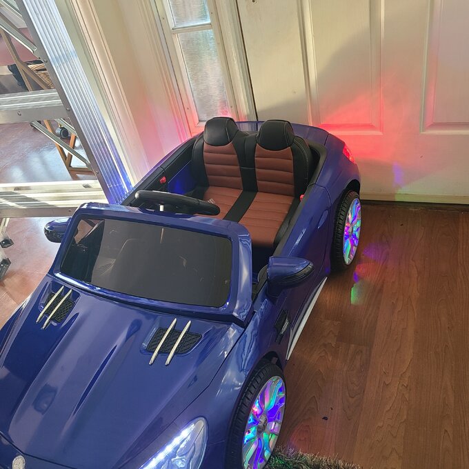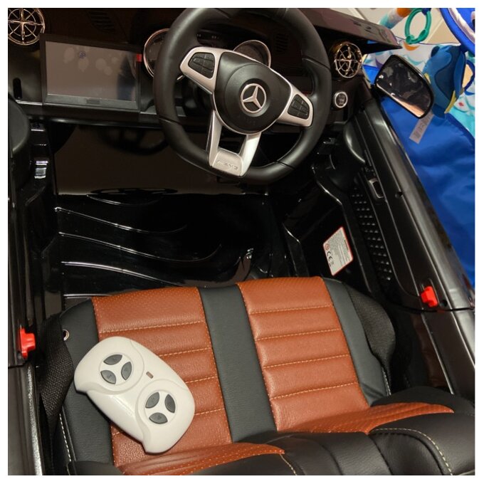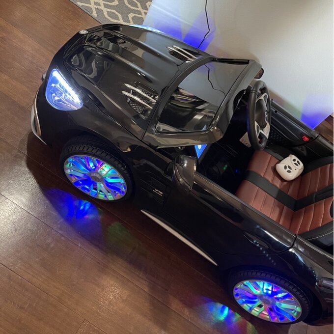 The children's car is equipped with a soft eco-leather seat and plastic wheels that will provide smoothness and noiselessness to the car. Ride on the car will delight your child because it is so similar to an adult car of the brand. A beautiful shiny exterior and an open-top make the model very stylish. The speed of the kid's car reaches 3-4 mph. Both your and your child can listen to music that is controlled by an MP4 touchscreen media system. In addition to the standard recorded melodies, you can record your own or even play cartoons for your child. A kid can drive himself/herself, or can simply enjoy a trip while parents control it using a remote. There is no need to worry about safety because there are safety belts – all the features as in an adult’s car. The electric car is equipped with plastic wheels and the front ones are driving.