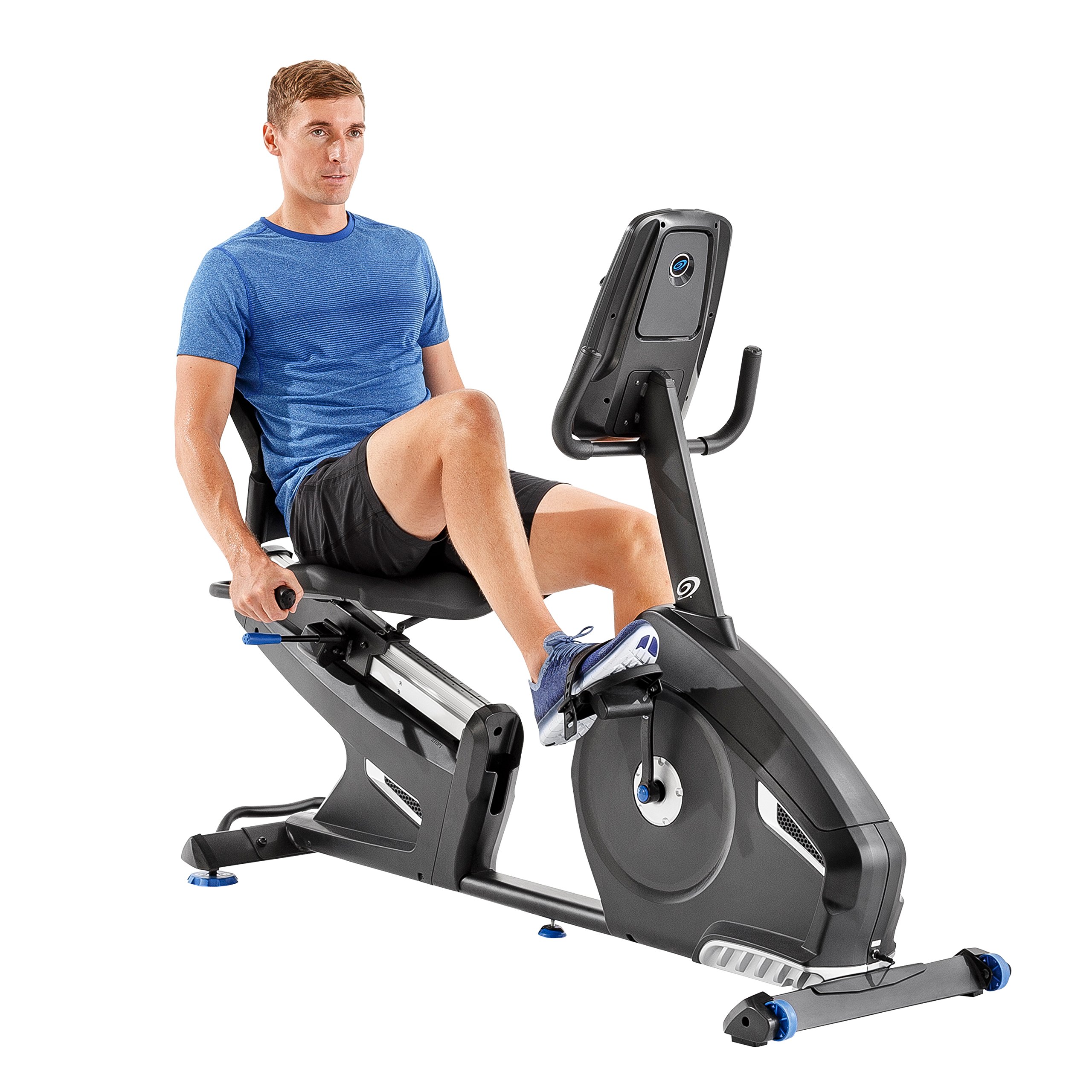 - Adjustable Sight Line console with dual blue backlit screen features 29 customizable workout programs