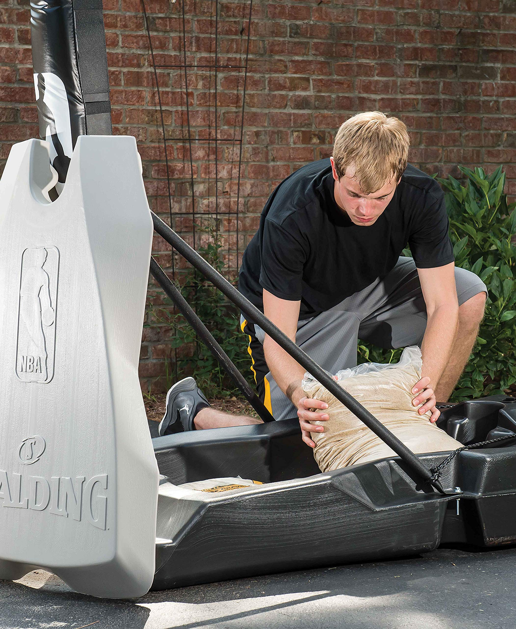 - Ultimate Hybrid base fills with 19 gallons of water and five 50-pound bags of sand