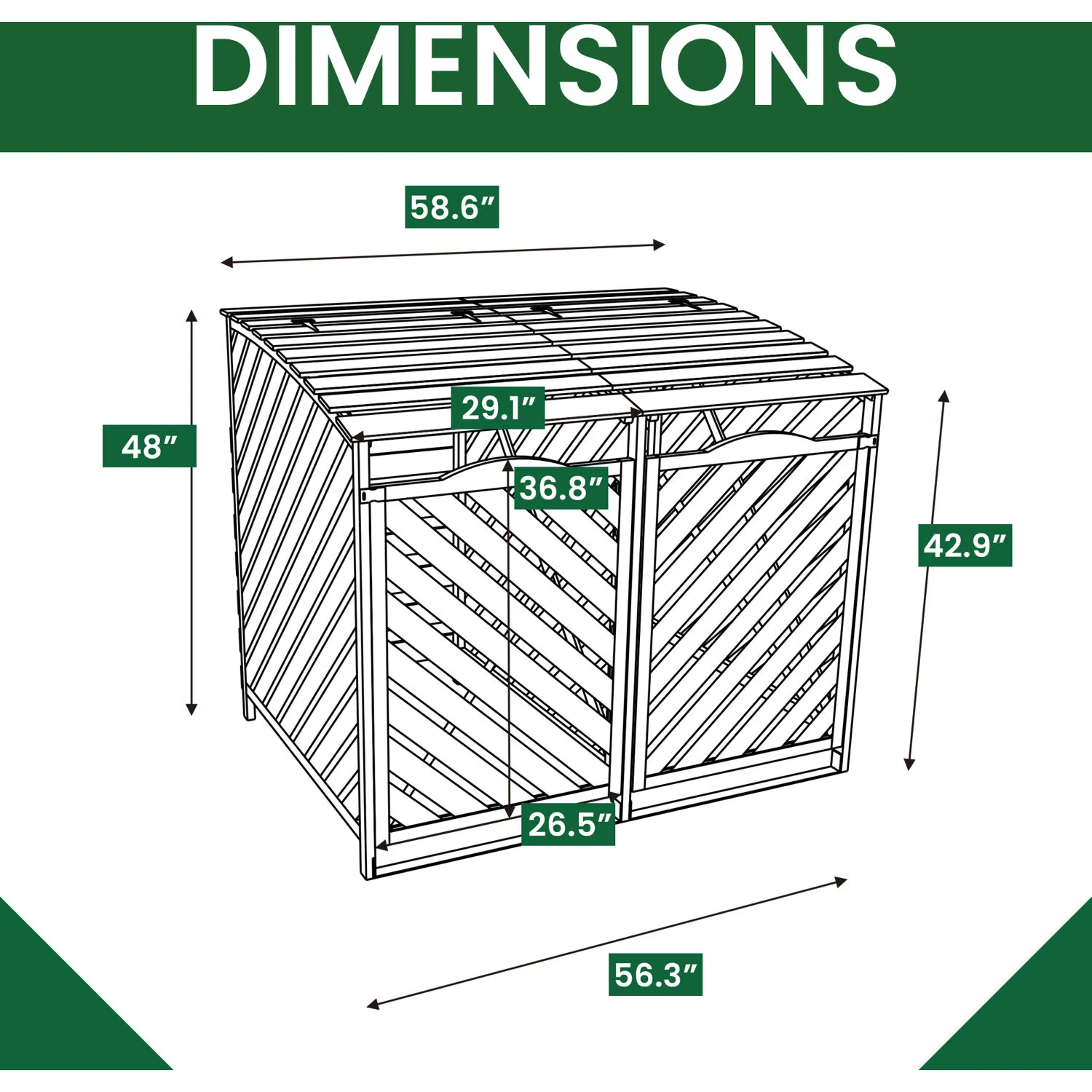 - Efficient design: Designed to fit up to 2 60 gallon garbage cans or recycling bins. The shed comes equipped with a locking latch to keep pests out and your items safely inside. Perfect fit for any backyard, patio, or lawn.