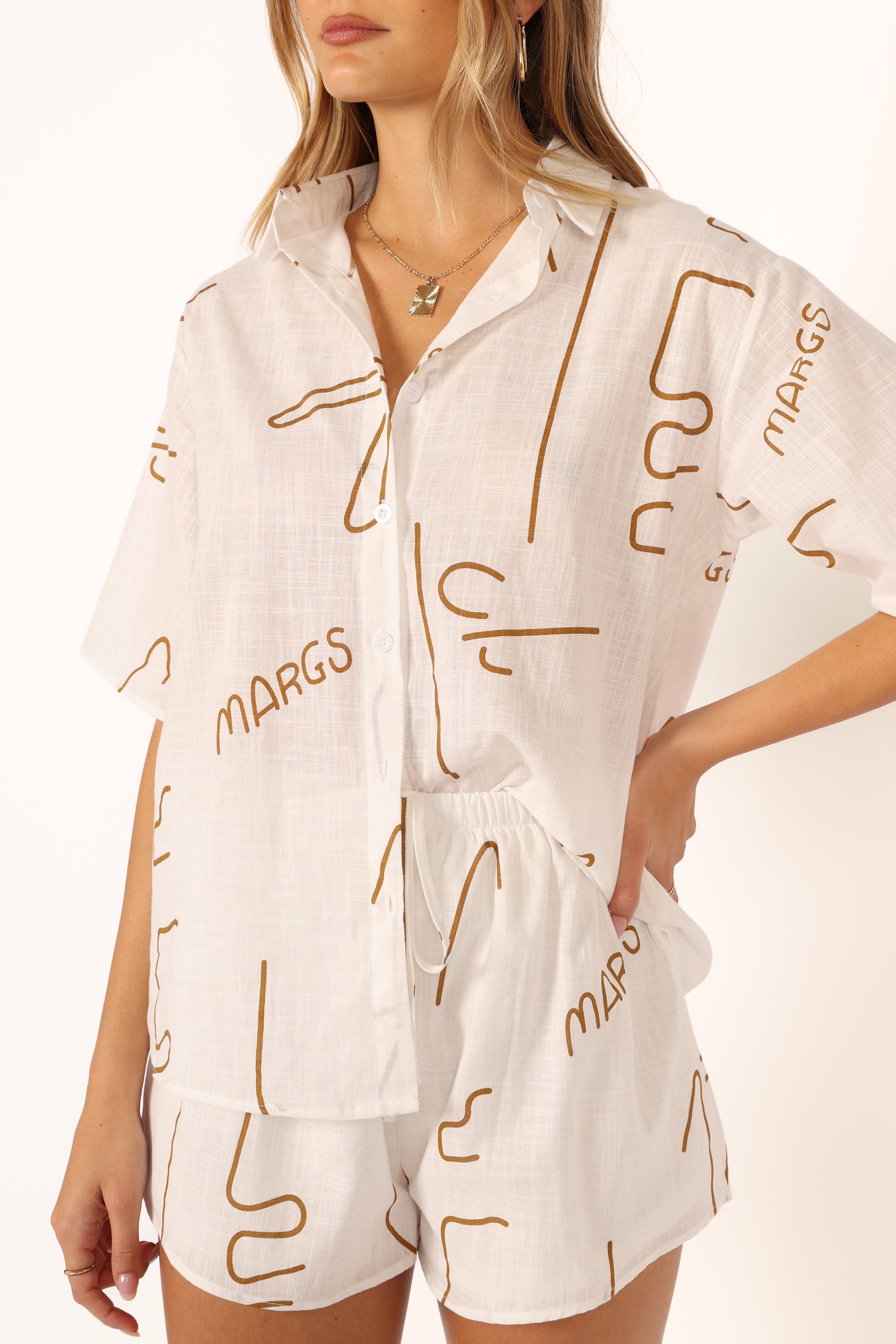| DETAILS Say hello to summer with this fun and flirty top and shorts set! This two-piece ensemble features a spread collar, V neckline, short sleeves, and front functional button close. The high waisted style shorts come with an elasticised waistband and non functional tie detail for added charm.