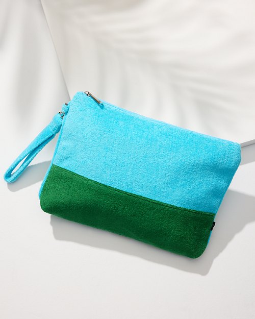 Soft, on-trend beach terry makes this clutch a shore day must-have. With a water-resistant lining and convenient wrist strap, after a long day of sun and sand, just throw your wet swimsuit in the bag and head out for post-beach cocktails.