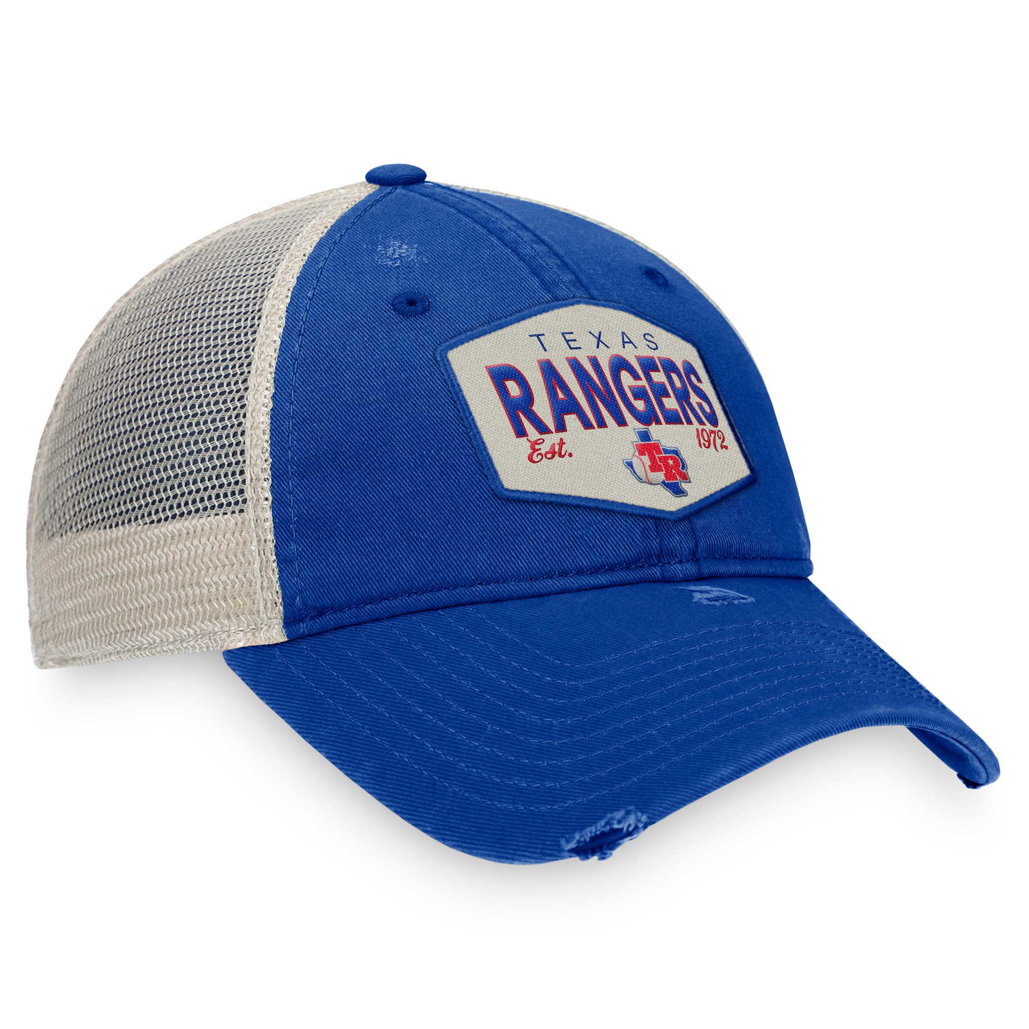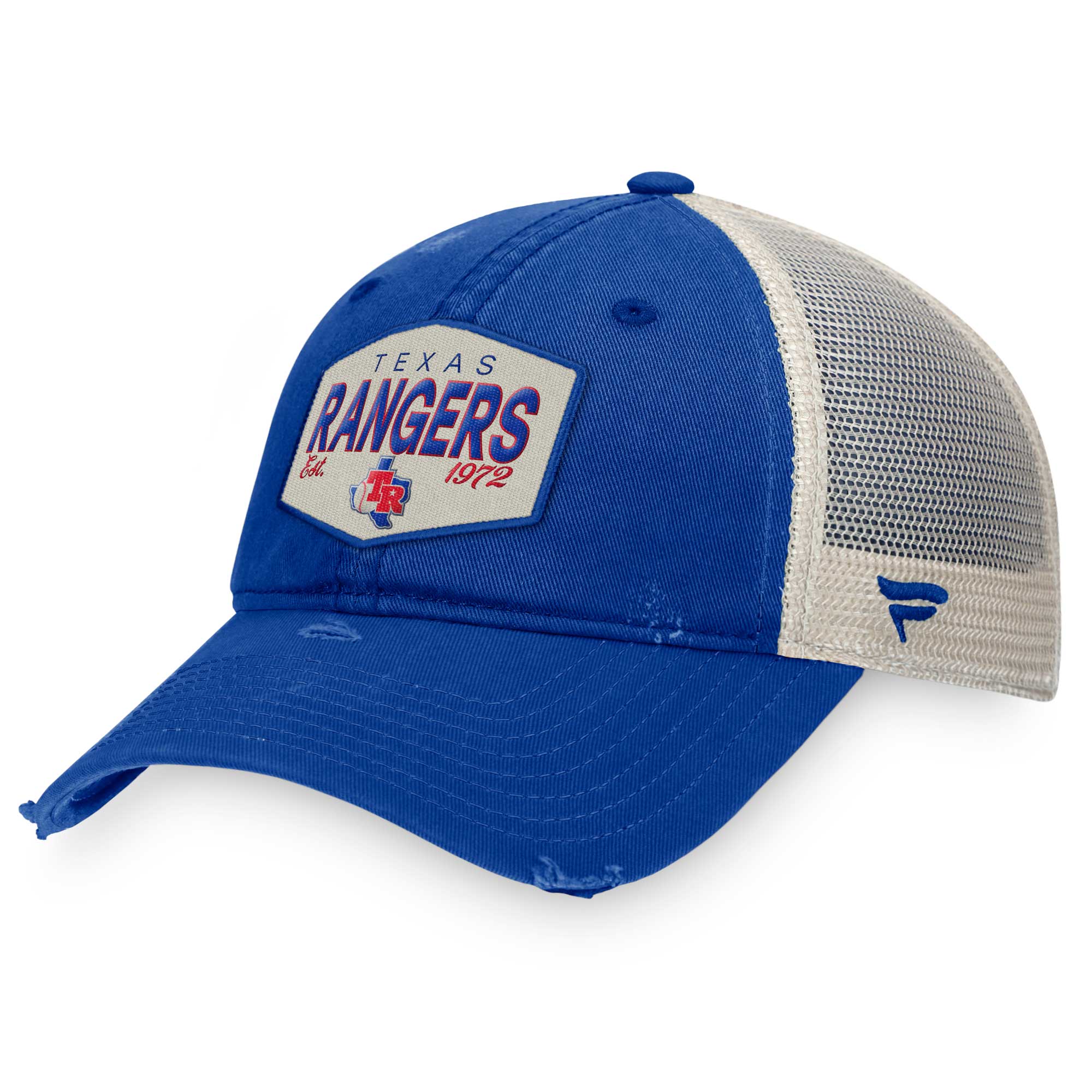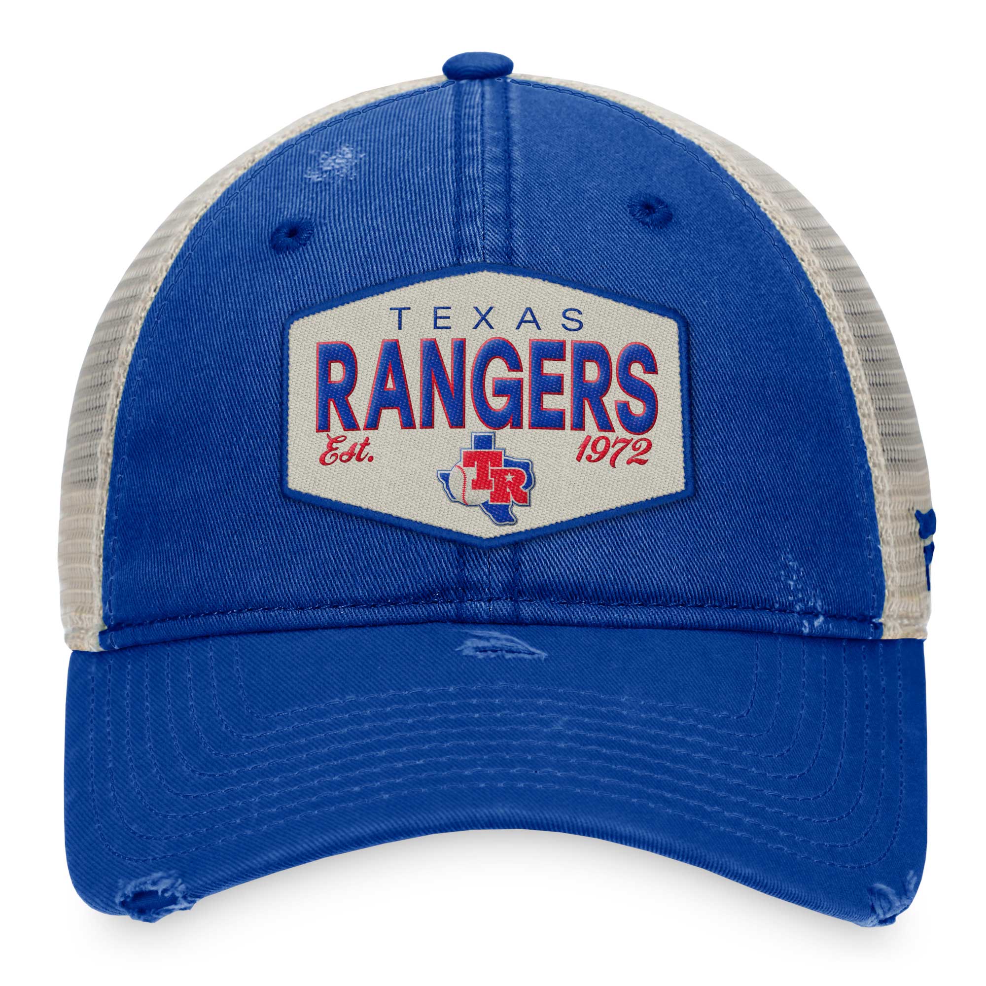 Bring some vintage flavor to your showing of unwavering enthusiasm for the Texas Rangers by adding this Patch trucker hat from Fanatics Branded to your gear collection. It features a bold Texas Rangers applique embroidered on the team-color front panels and distressed fabric that draws attention to your favorites. Mesh panels also provide a breezy feel while the snap closure makes customizing the fit easy.