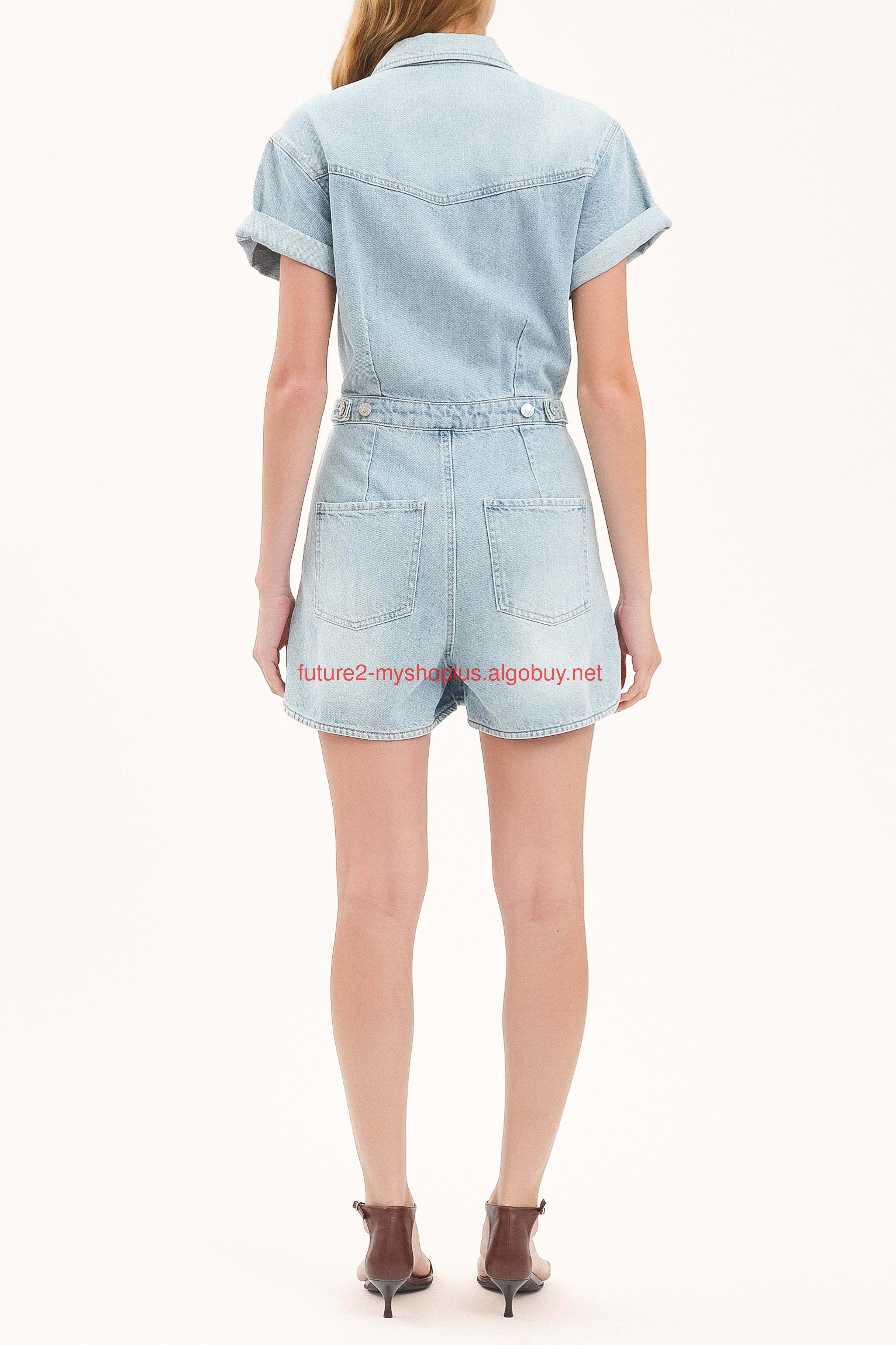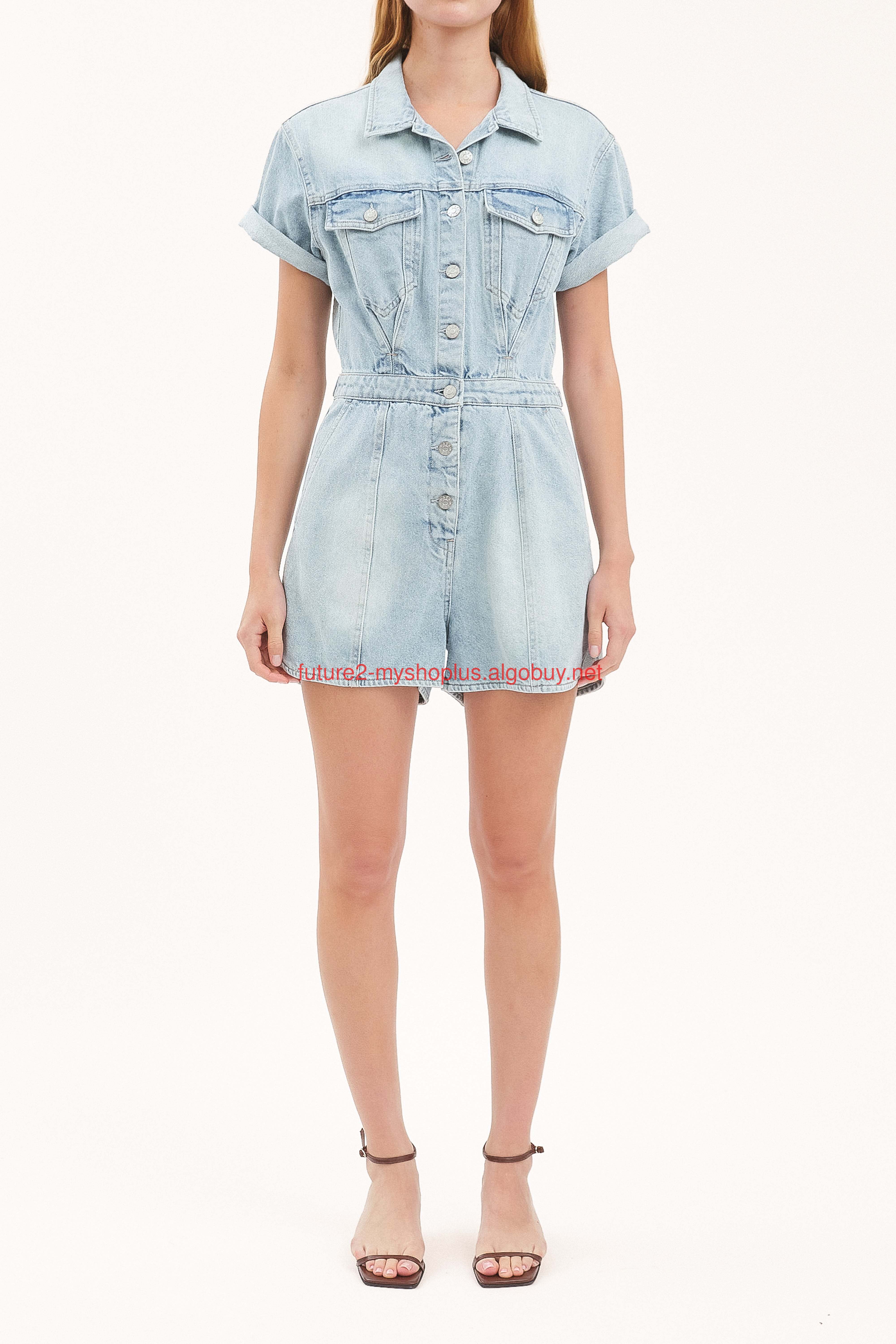 DETAILS A brand new addition the Topanga denim romper. Created from a non stretch fabric, this romper features a snap front with a curve defining elastic waist.