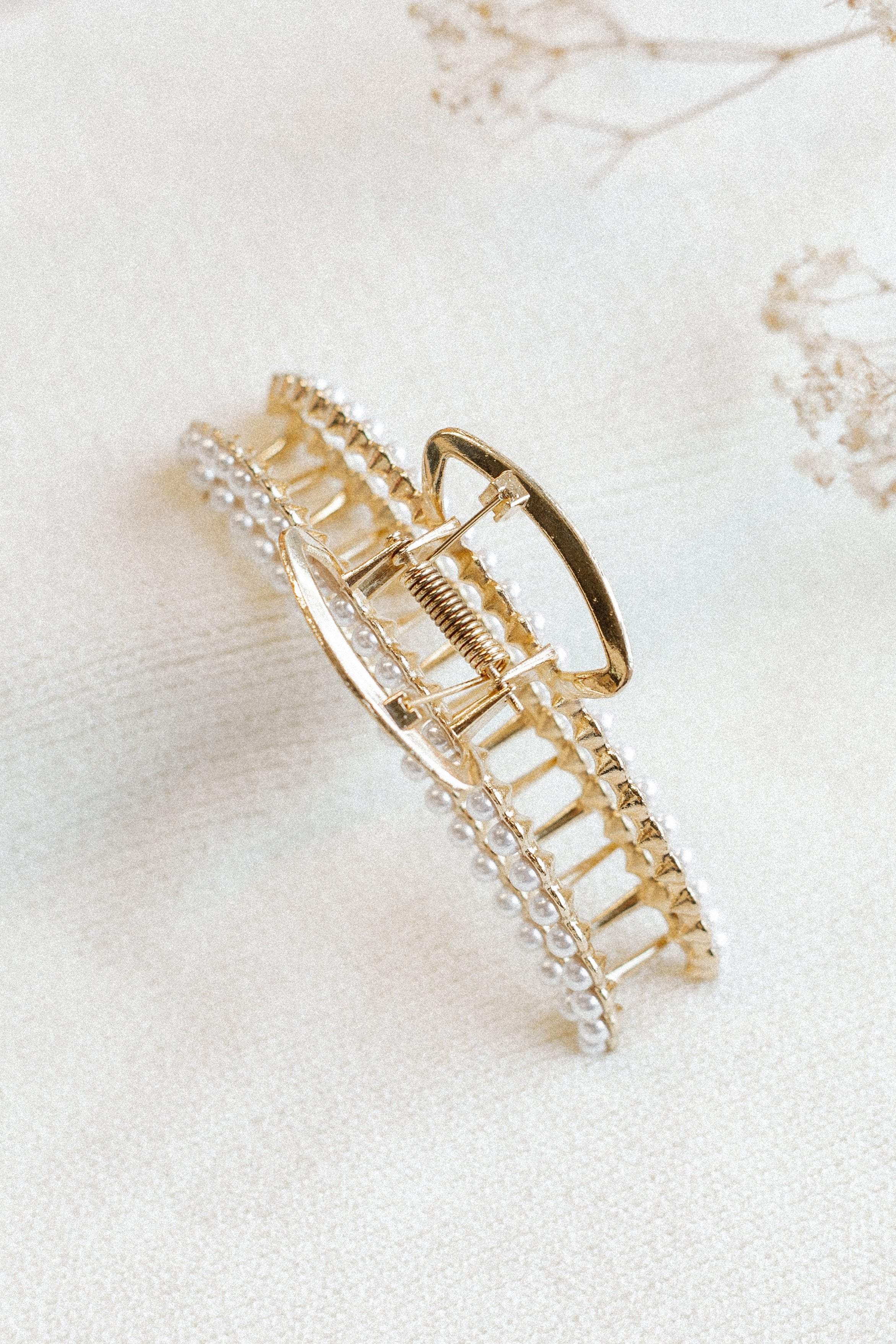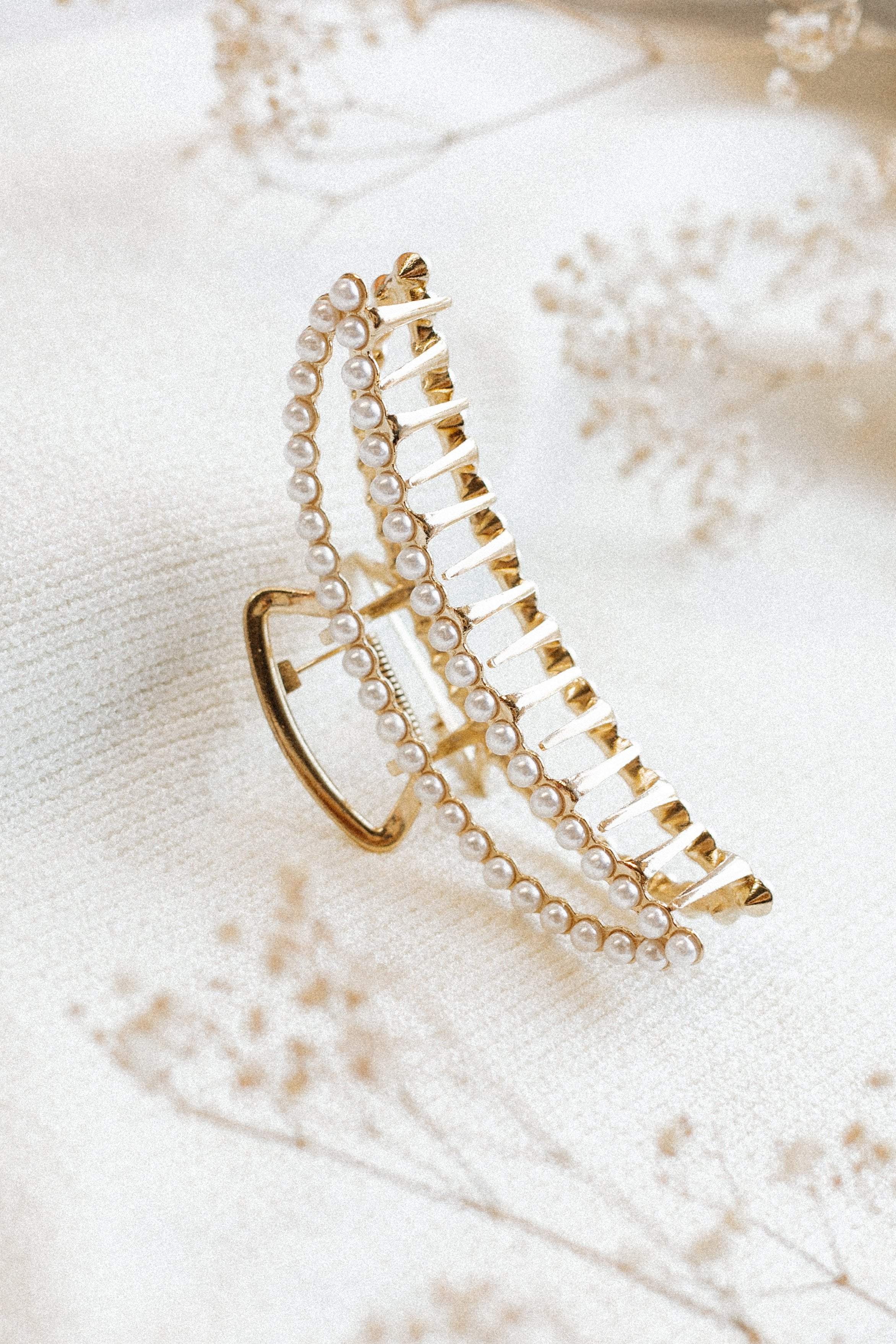 DETAILS Are you looking for the perfect finishing touch for your outfit? Look no further than this chic and stylish hair clip! With its claw style, gold colour and pearl detail, this stunning accessory will add a touch of glamour to any look.