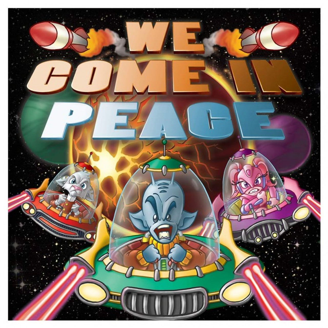 We Come in Peace is a fun, fast, strategic game for 2-6 players. Opponents roll Invasion dice, sending flying saucers to attack your planet's cities. Use Defense dice to fight back! Blasters repel invaders. Use Rebuilds to repair and replace your destroyed cities, while Missiles allow you to deal out some damage of your own to opponents' planets. Be the alien with the least damage at the end of the game to claim a victory of galactic proportions!