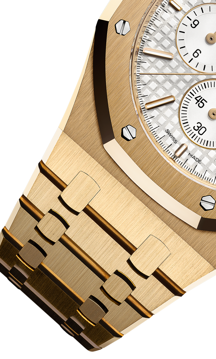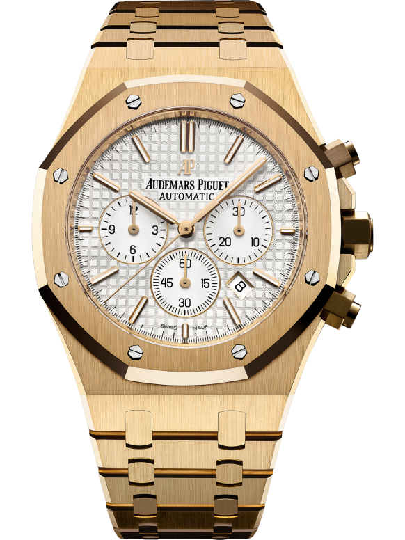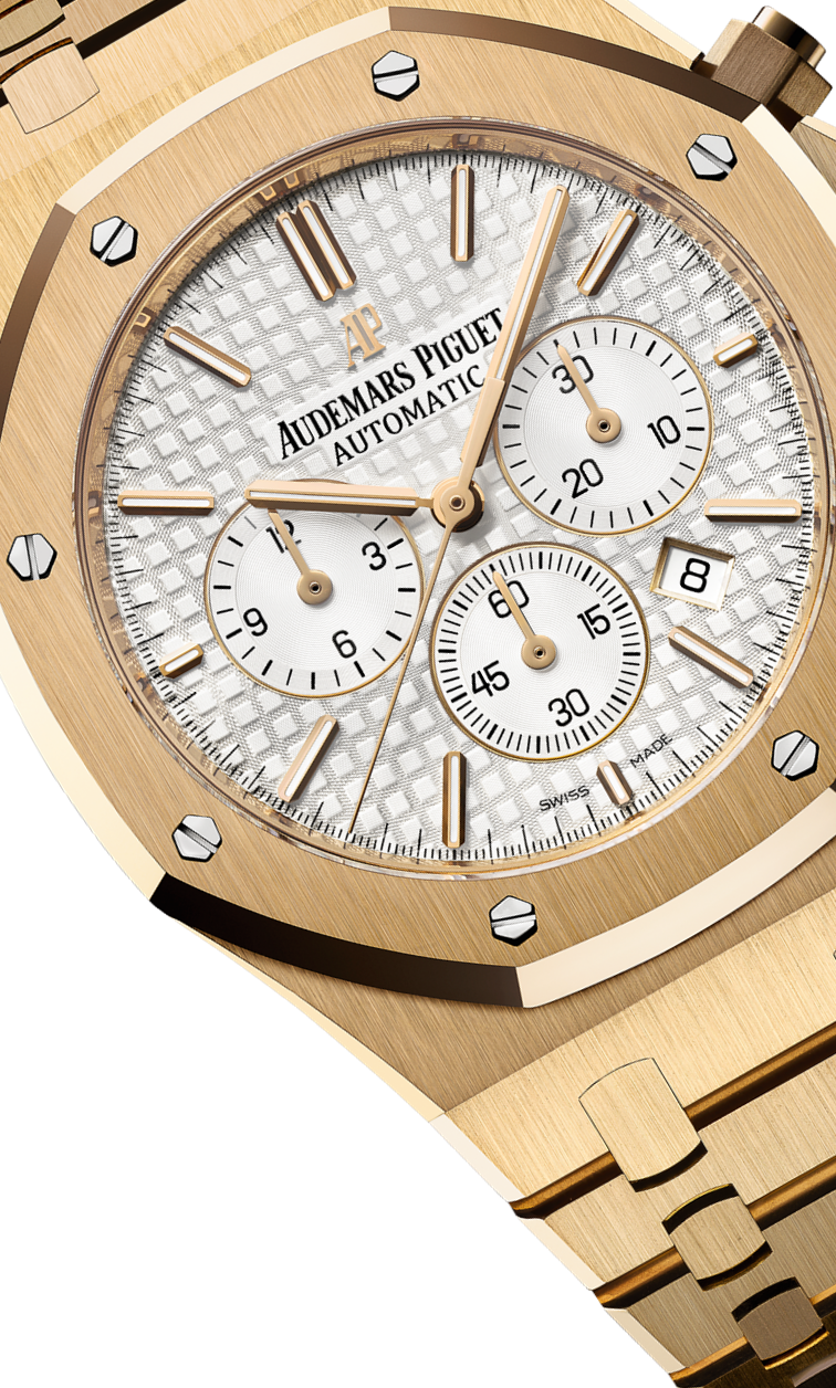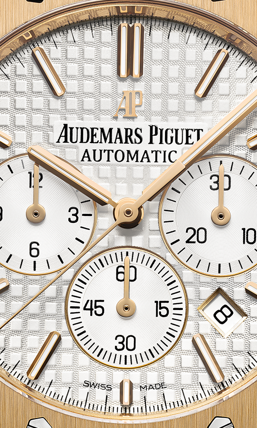 DIAL : White dial with “Grande Tapisserie” pattern, White counters, yellow gold applied hour-markers and Royal Oak hands with luminescent coating