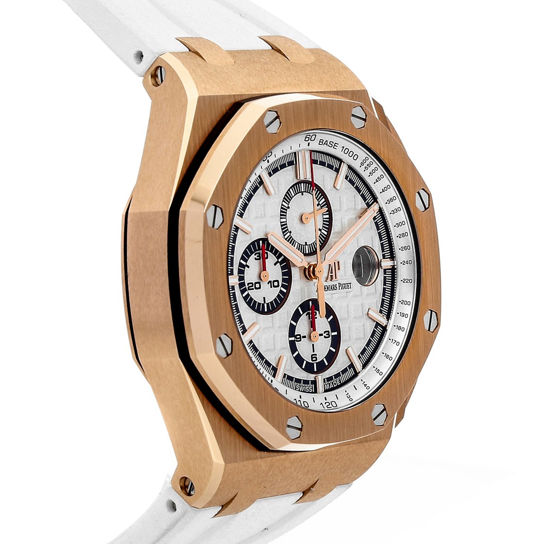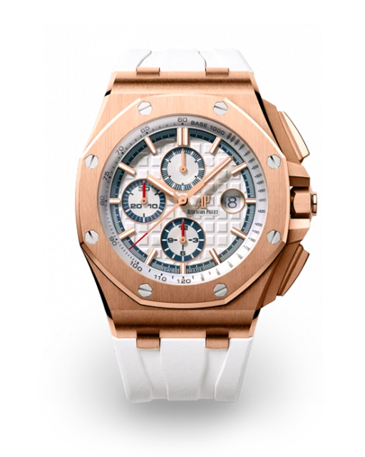 DIAL : White dial with “Méga Tapisserie” pattern, pink gold-toned counters, pink gold applied hour-markers and Royal Oak hands with luminescent coating, White inner bezel.