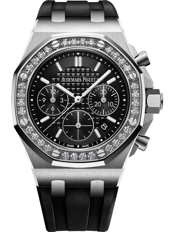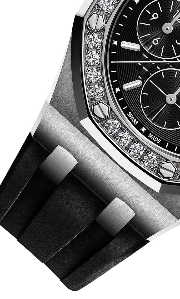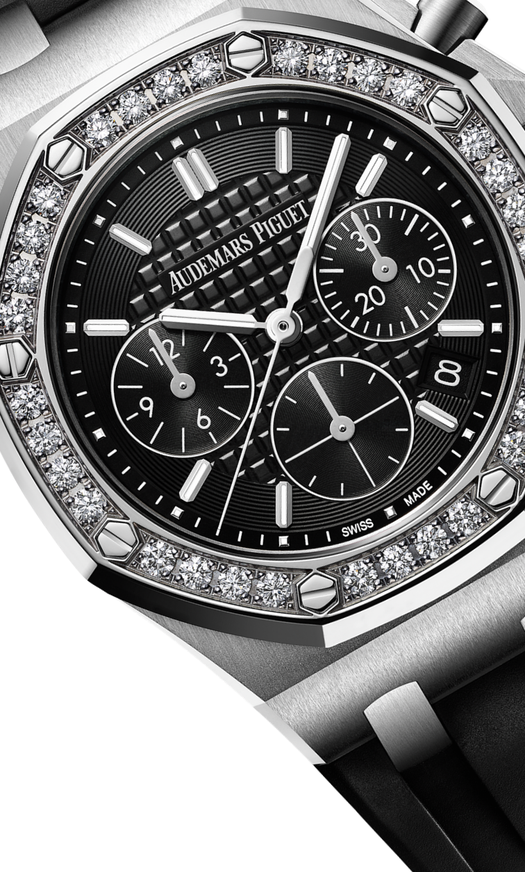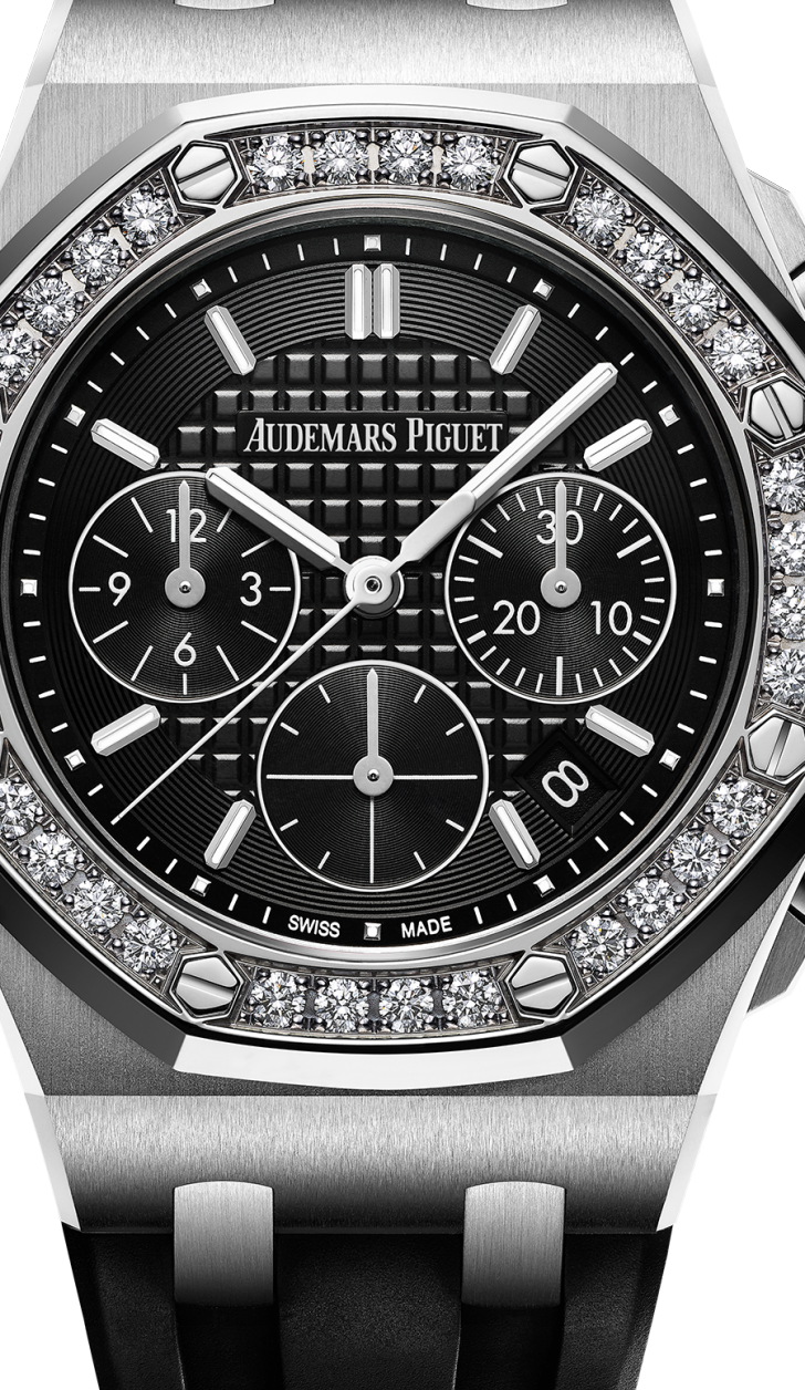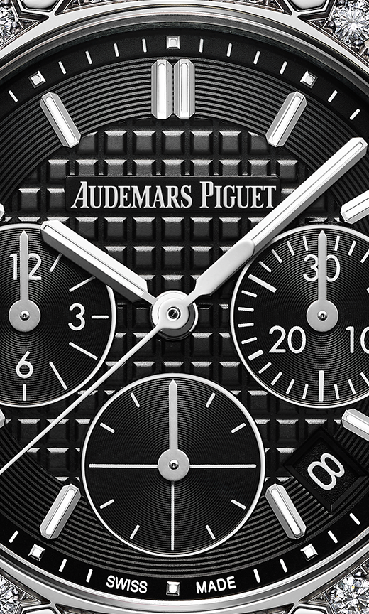 DIAL : Silver-toned dial with “Lady Tapisserie” pattern, grey ruthenium-toned counters, grey ruthenium-toned external zone, pink gold applied hour-markers and Royal Oak hands with luminescent coating.