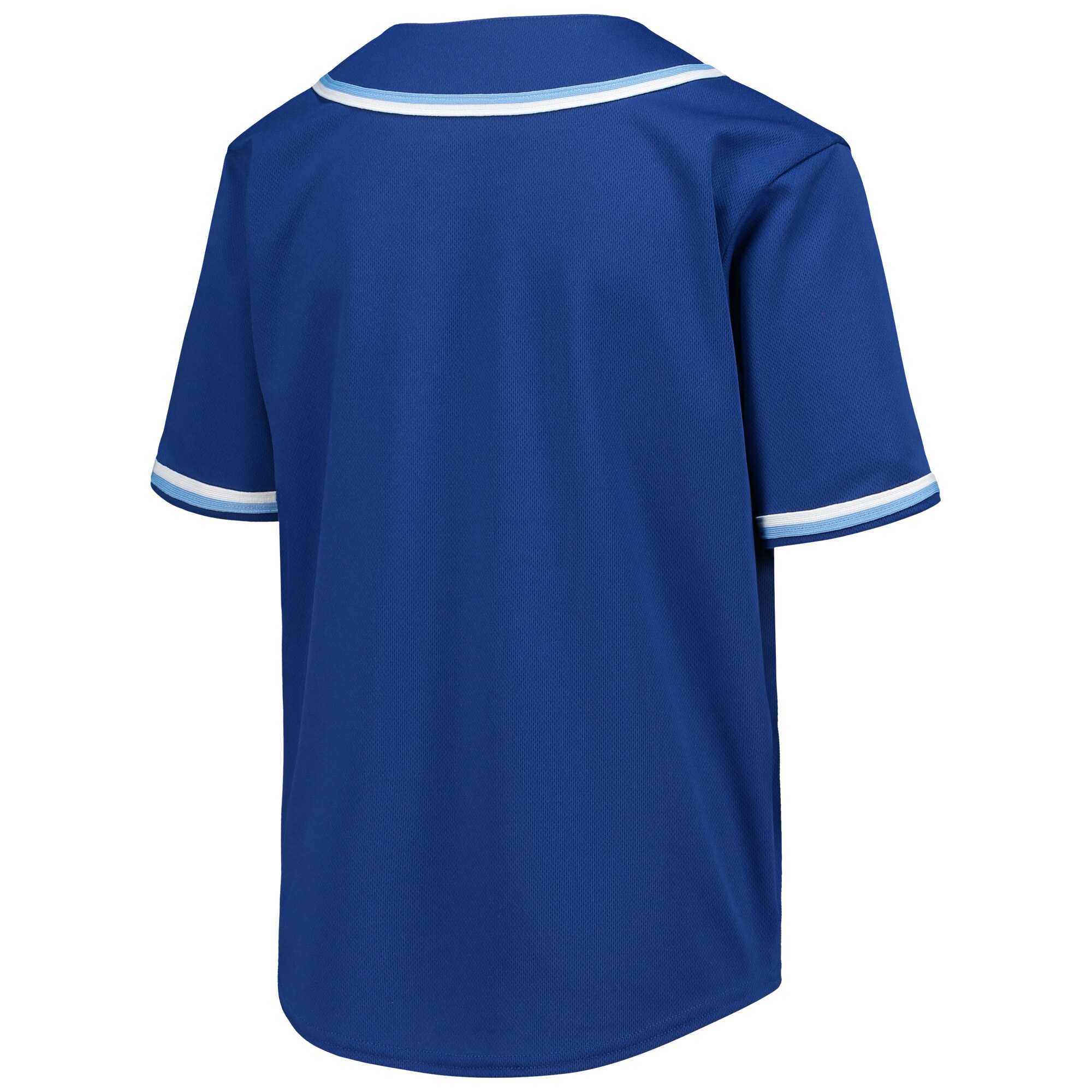 Help your kid show their love for the game with this Kansas City Royals jersey. It has a full-button front sewn-on stripes and a rounded droptail hem to create the classic ballpark look. Best of all the printed Kansas City Royals graphics help your youngster feel like they can take the field.