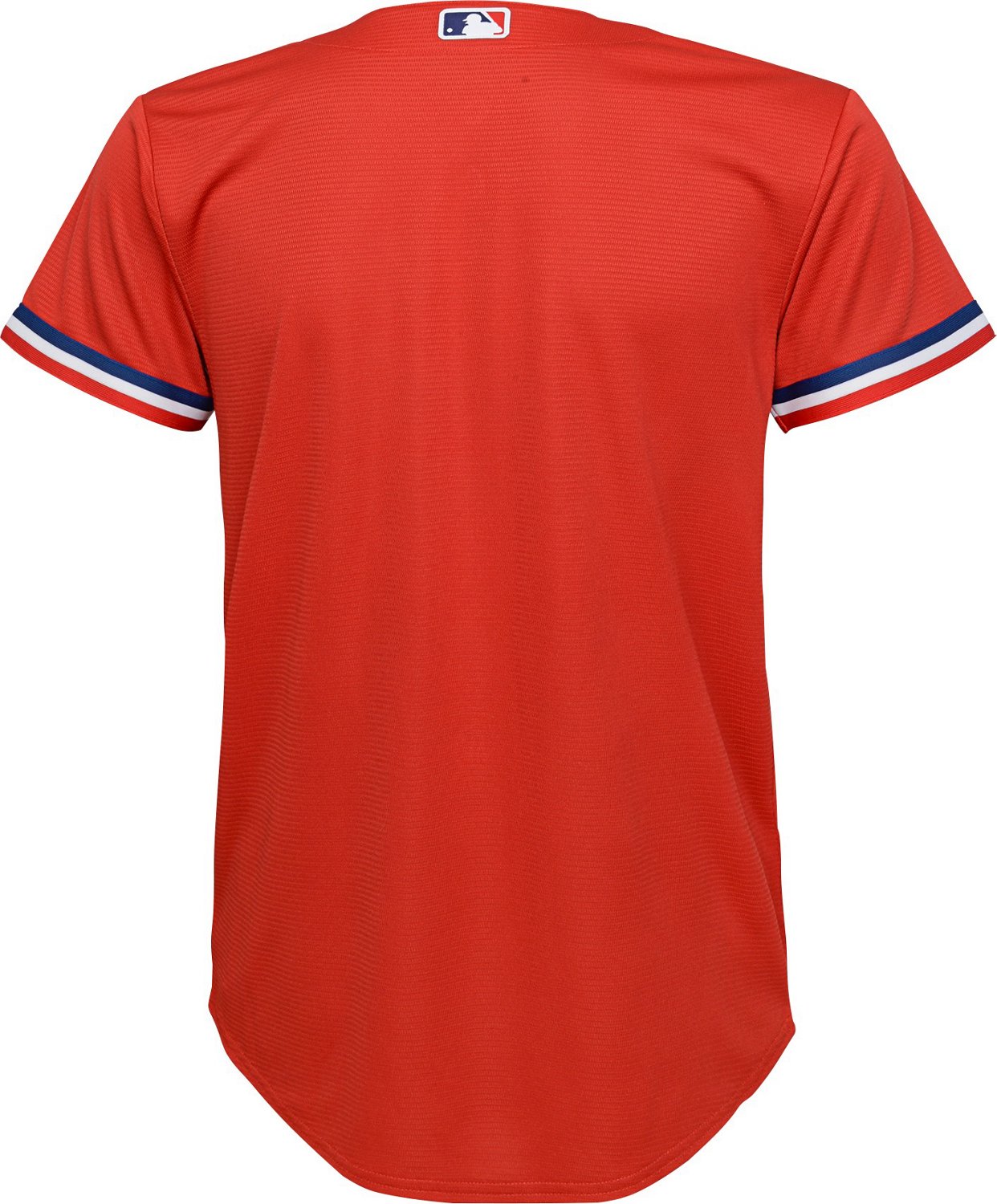 Display your fan pride in the Youth Texas Rangers Team Replica Finished Jersey. The team graphic provides a spirited look and the button-down front delivers an authentic on-field appearance.