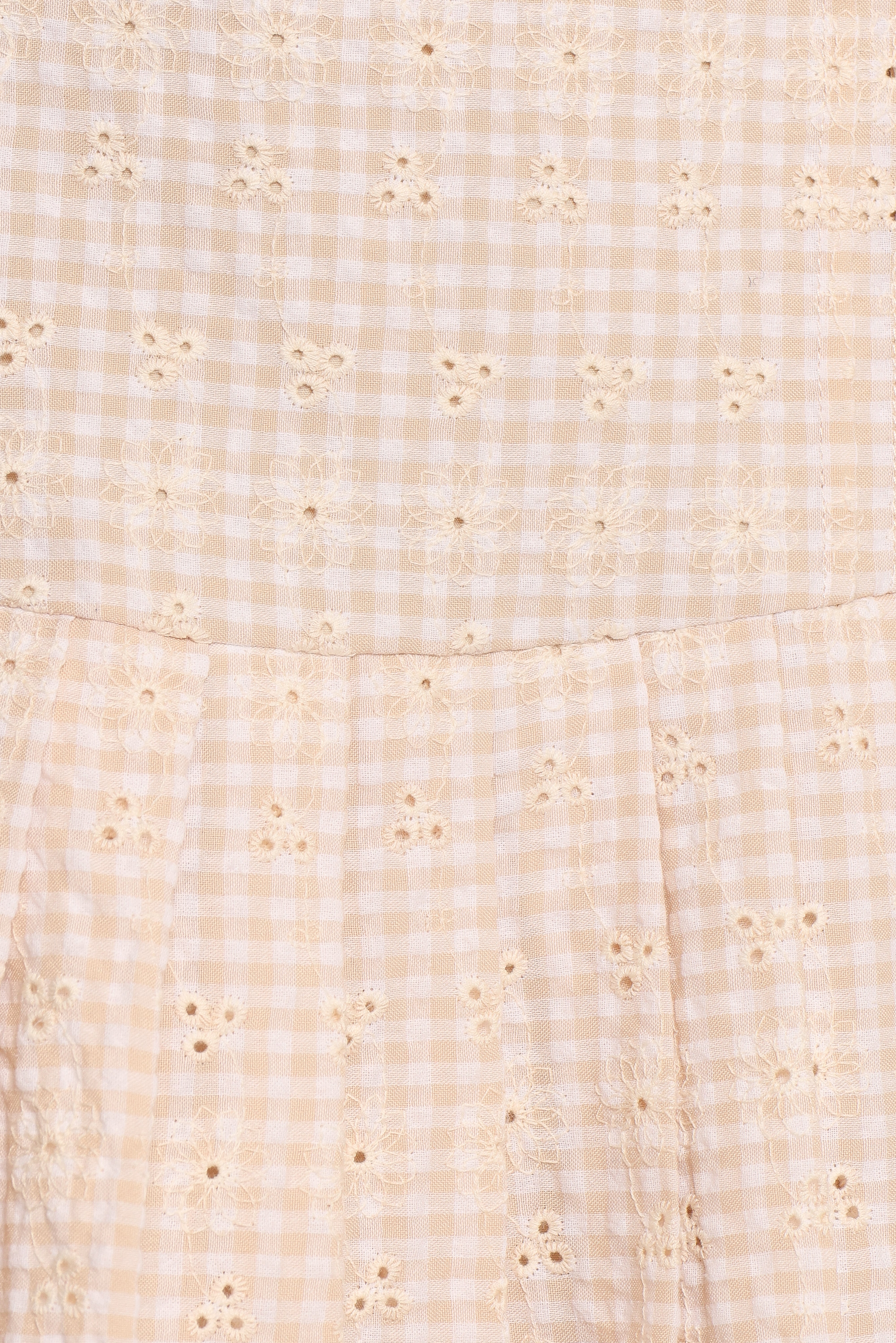 DETAILS Effortlessly elevate your wardrobe with the Zephyra Mini Dress in Cream. This chic piece combines timeless beige gingham with delicate embroidery anglaise fabrication for a look that's equal parts modern and classic.