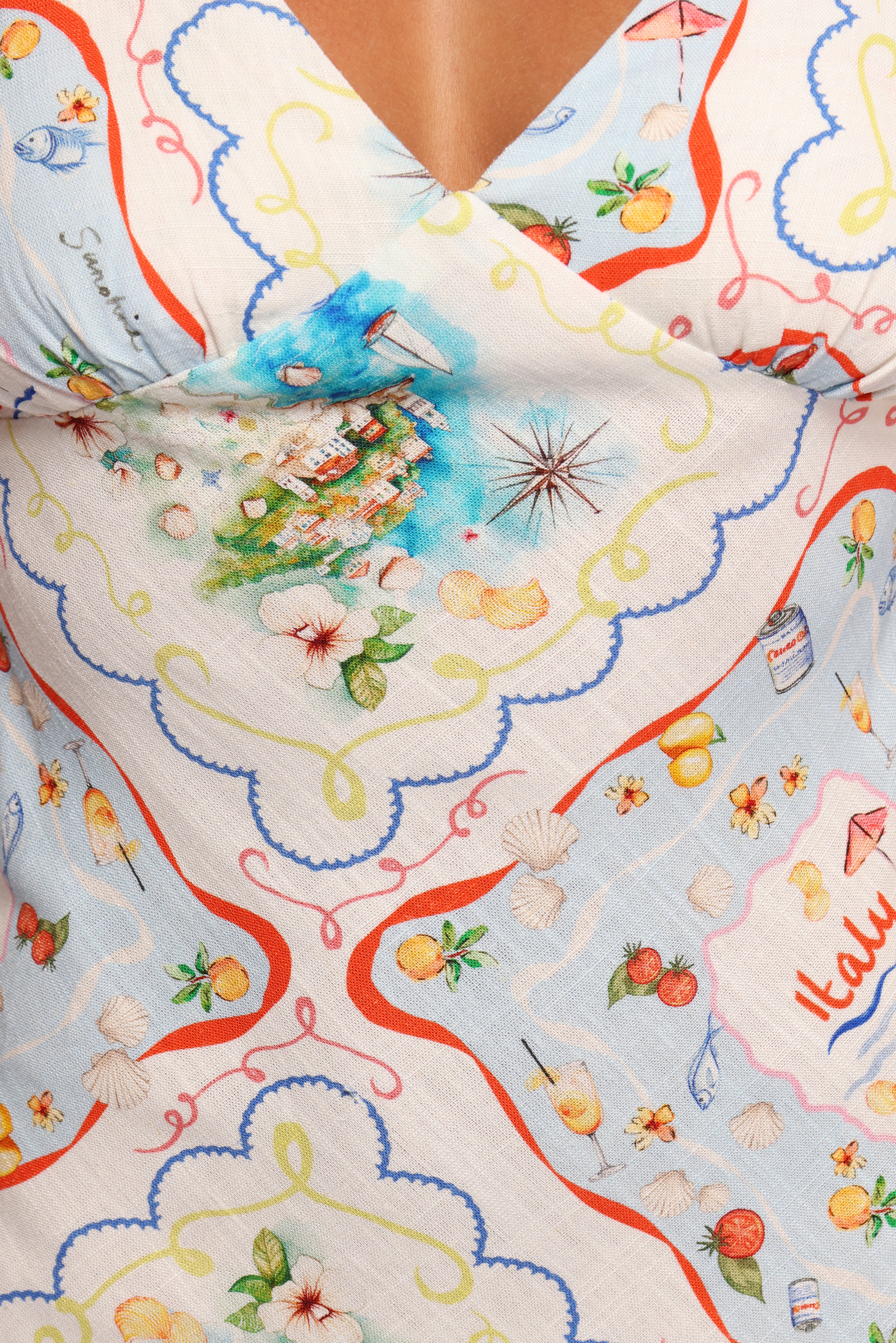 DETAILS This stunning piece, featuring a captivating Italian motif print, effortlessly transforms any occasion into a stylish affair. The midi length offers a versatile silhouette that's perfect for both daytime outings and evening soirees.