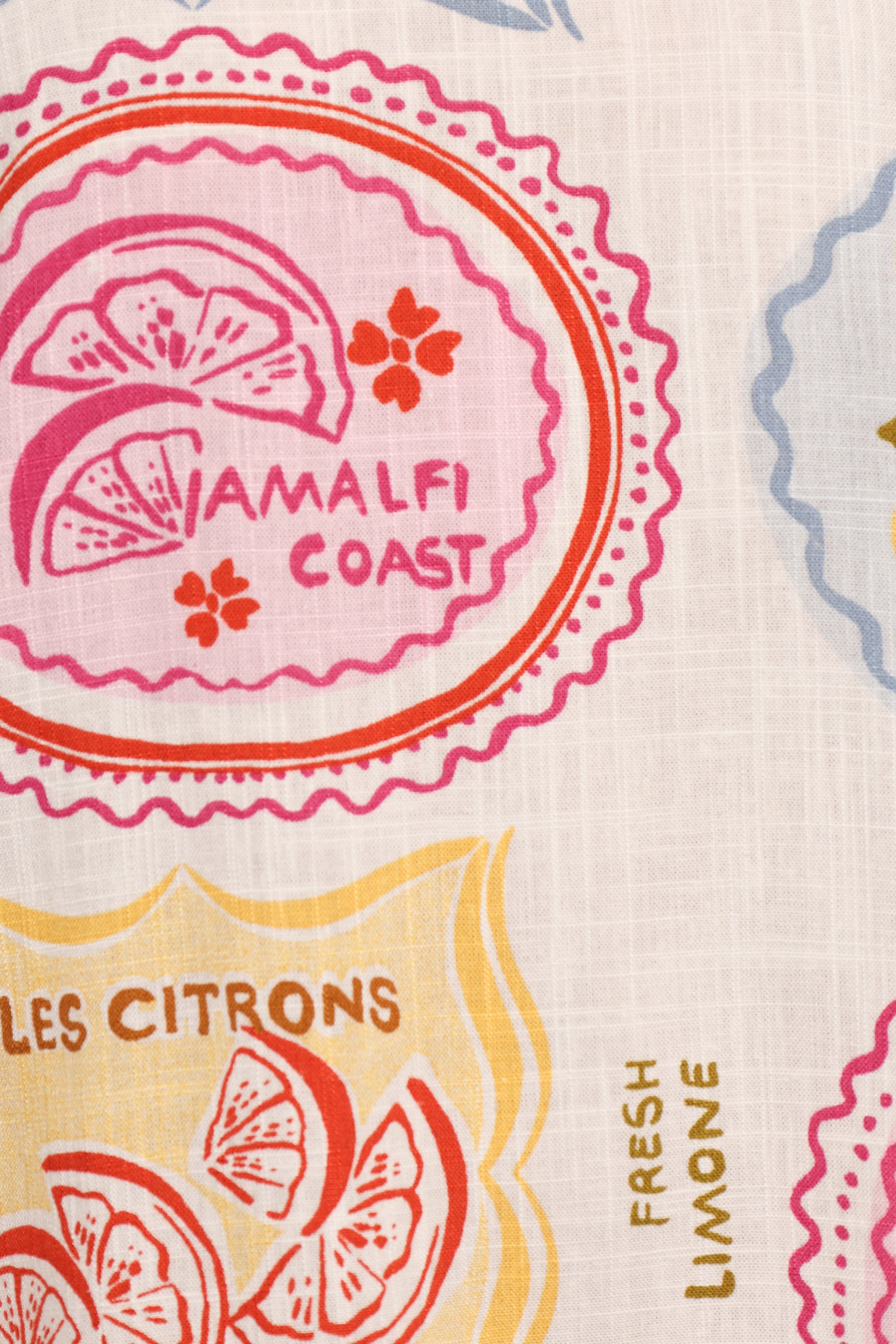 DETAILS This mini dress boasts a high round neckline and sleeveless design, capturing a look that's both elegant and effortlessly cool. With its vibrant Italian motif print, it transports you to the sun-drenched piazzas of Rome, adding a splash of Mediterranean flair to your wardrobe.